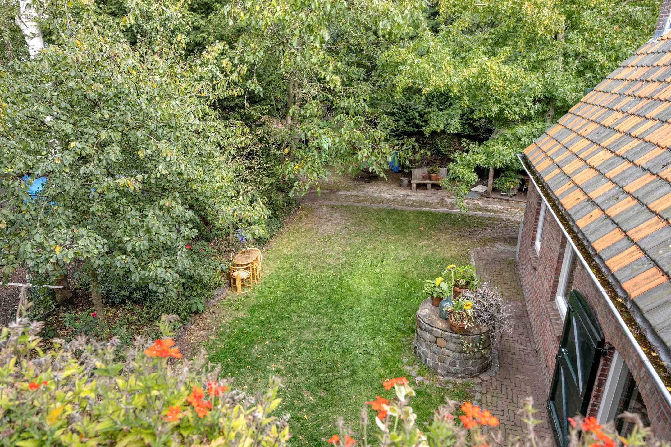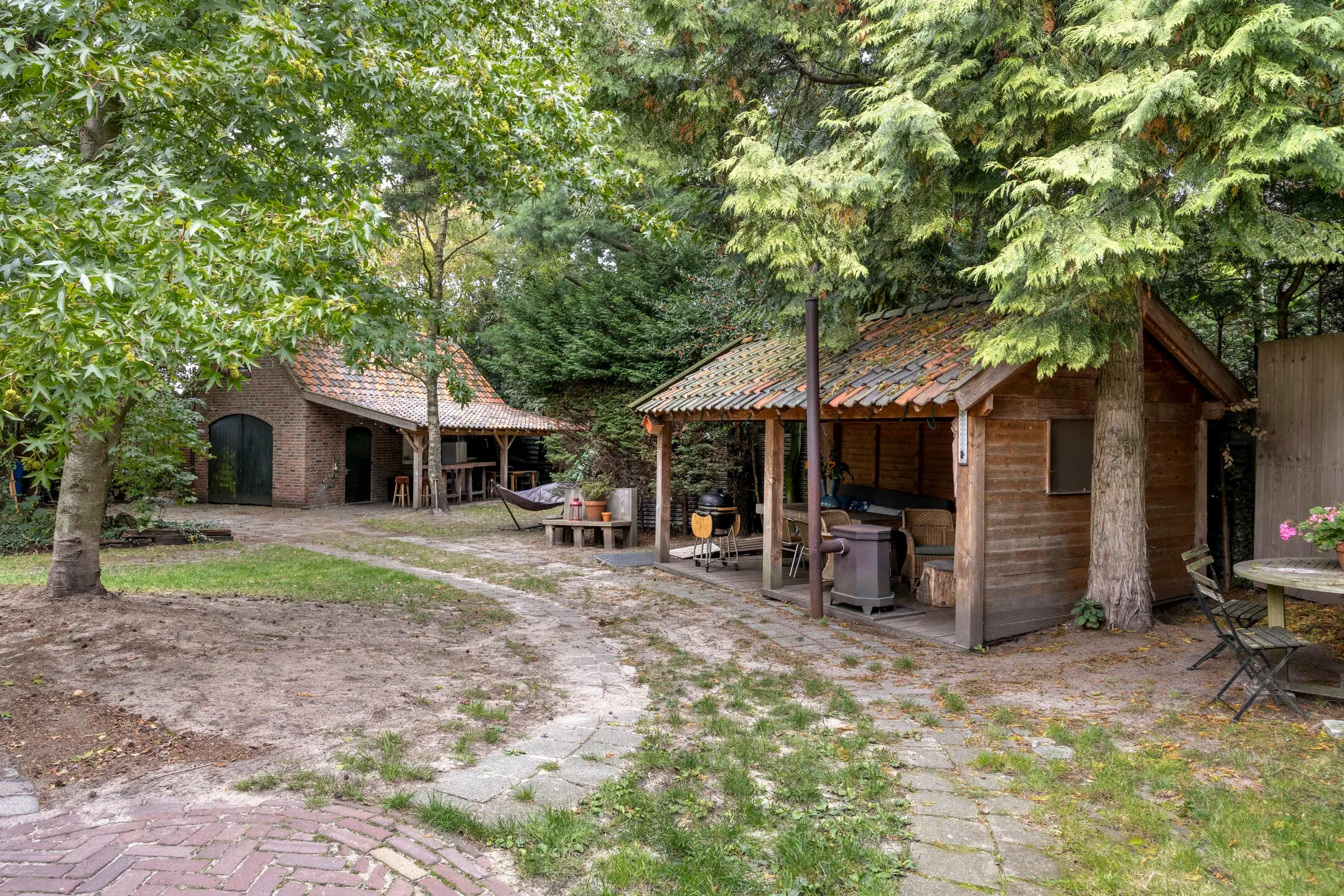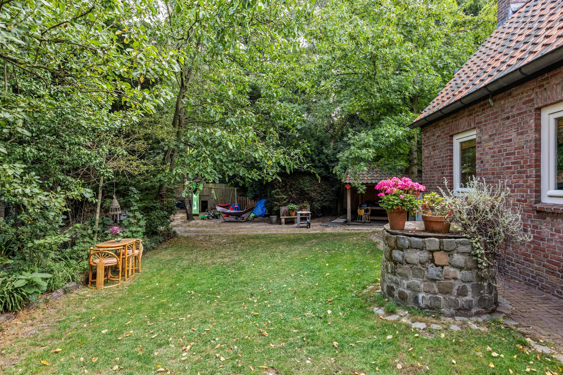 - Grote, fraai aangelegde tuin met overkapping, houtkachel, houtopslag, buitenkranen en waterput