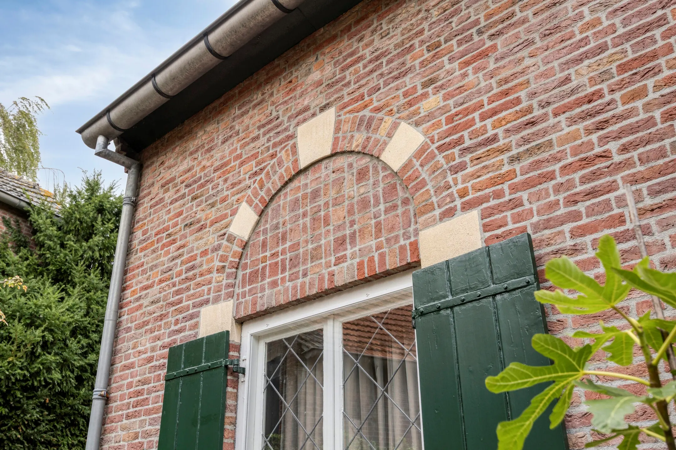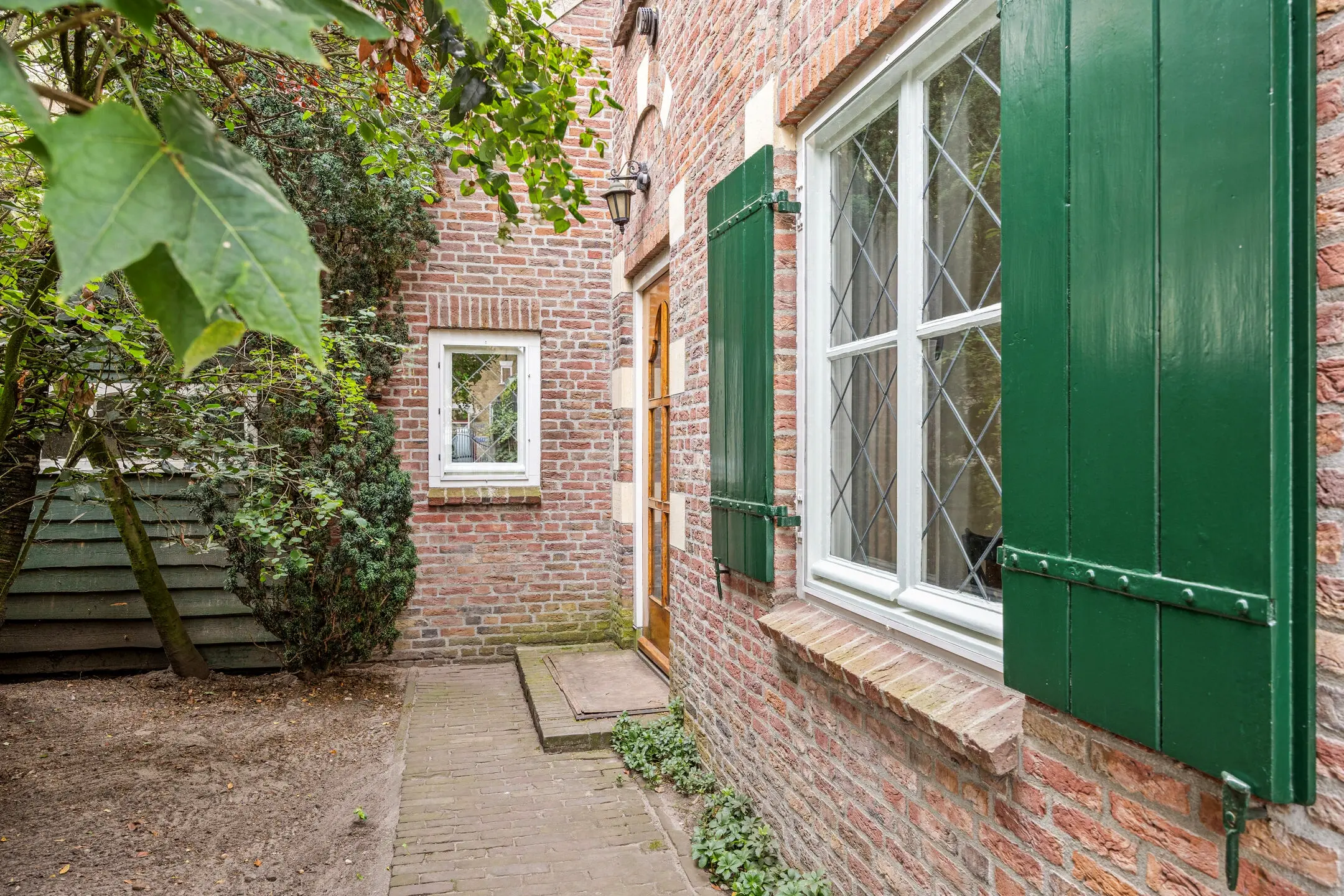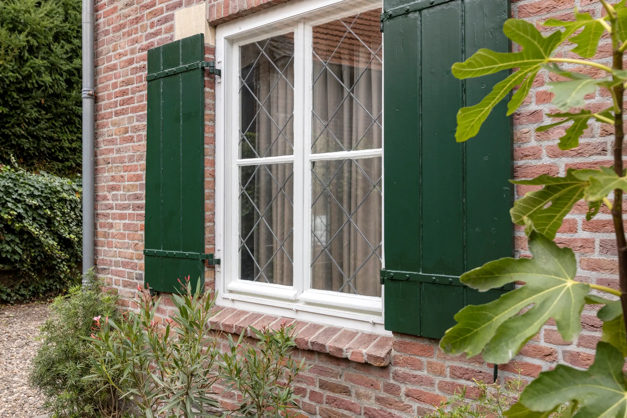 - Voorzien van houten kozijnen met dubbelglas en glas-in-loodramen met voorzetramen