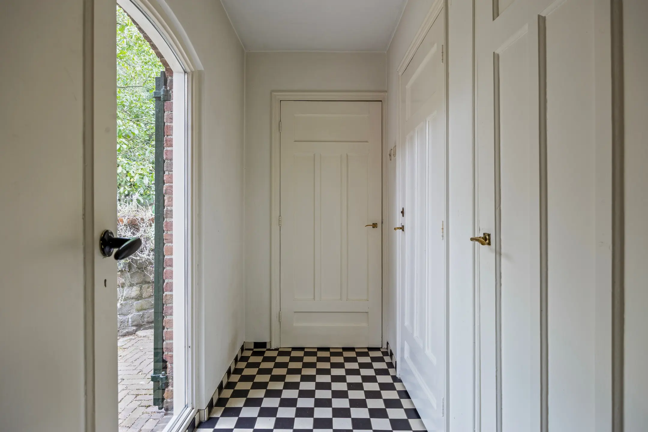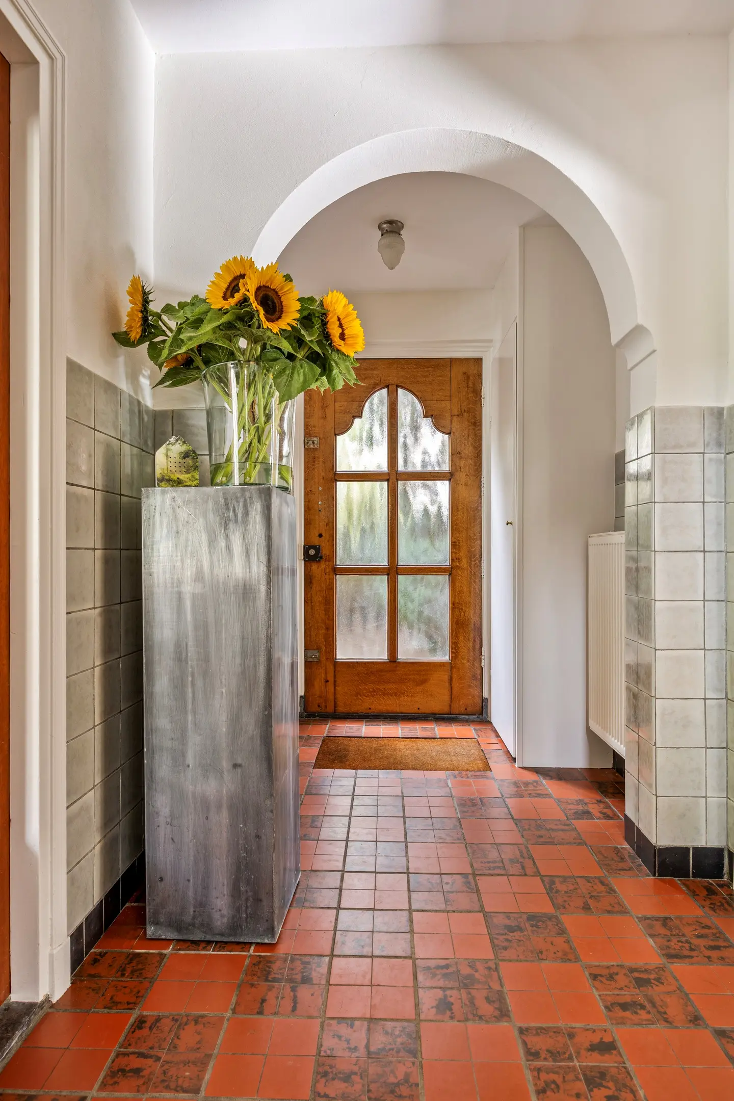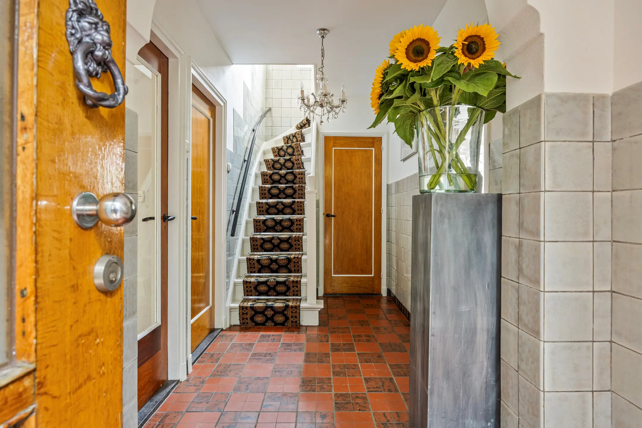 De entree aan de voorzijde van de woning verwelkomt u in een karaktervolle hal met authentieke details. Originele deuren, klassieke vloertegels en deels betegelde wanden met stucwerk erboven zorgen voor een warme en verzorgde uitstraling. Hier bevinden zich de meterkast en het toilet, uitgevoerd met een staand toilet. Vanuit de hal zijn de woonkamer, eetkamer en keuken bereikbaar en leidt de trapopgang naar de eerste verdieping.