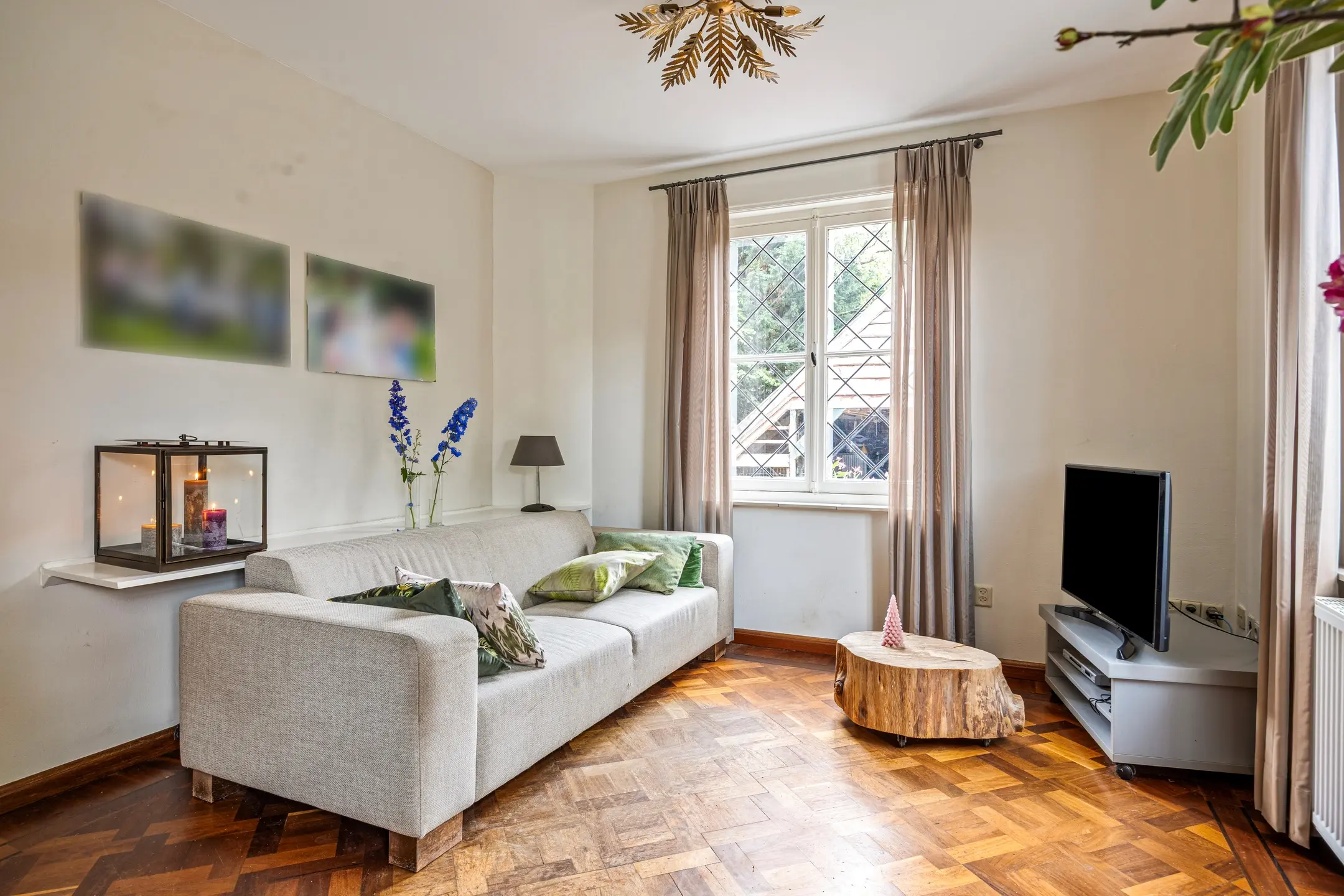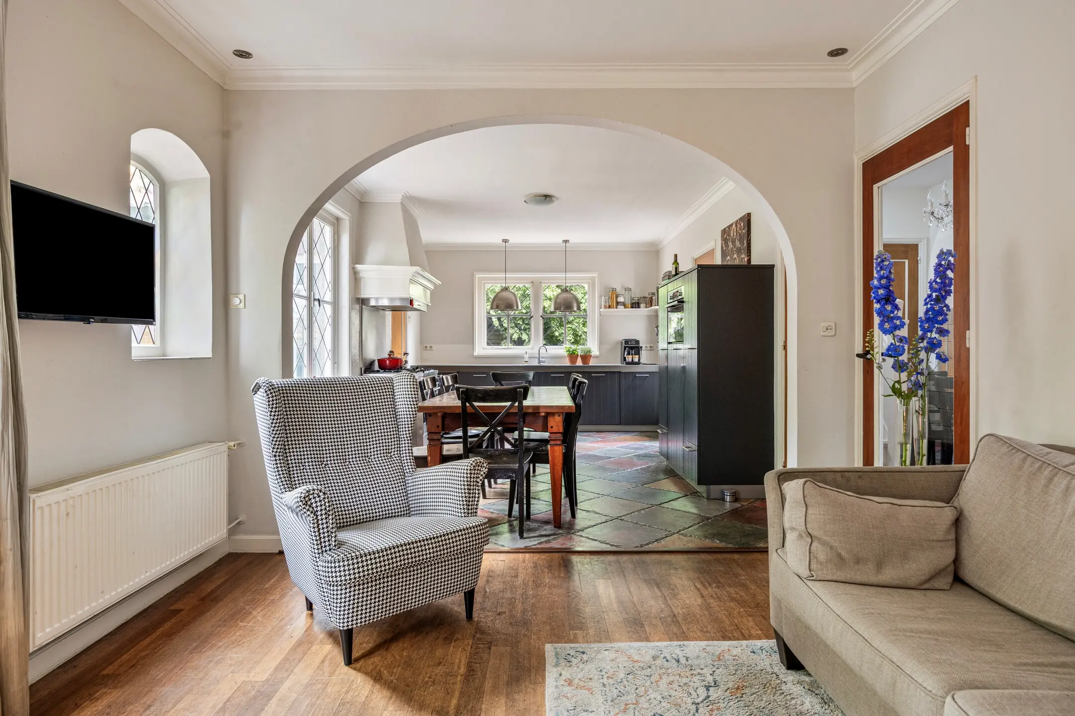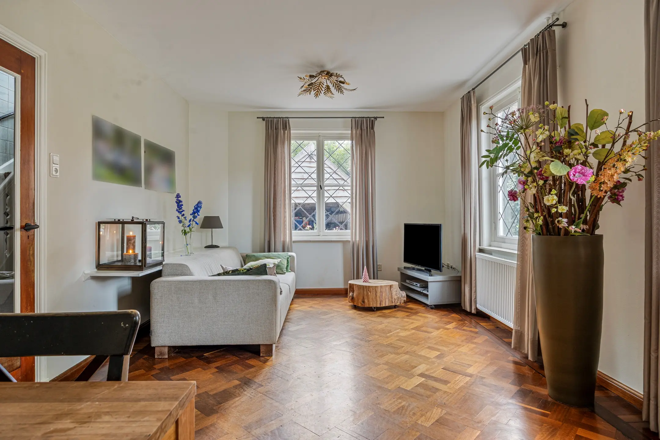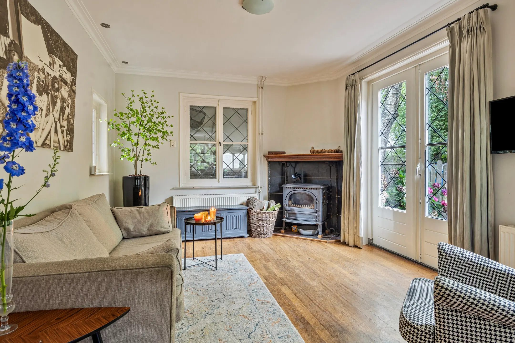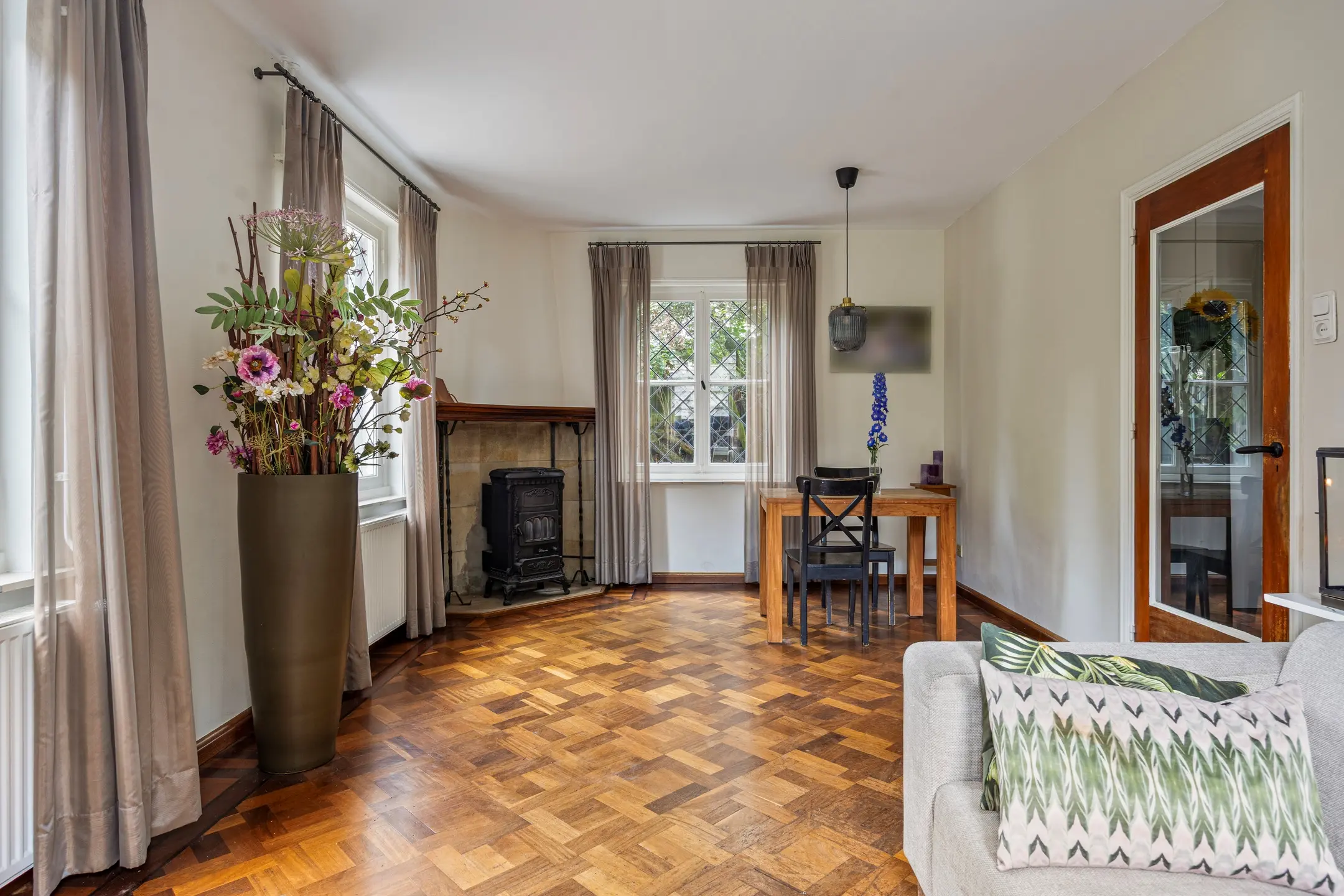 De woonkamer ademt sfeer en gezelligheid. De klassieke mozaïek parketvloer en strak gestucte wanden vormen samen een tijdloze basis, terwijl de glas-in-loodramen in ruitpatroon de ruimte een charmante en authentieke uitstraling geven. De gaskachel biedt niet alleen warmte, maar creëert ook een knus middelpunt in de kamer, ideaal voor lange avonden in huiselijke sfeer.