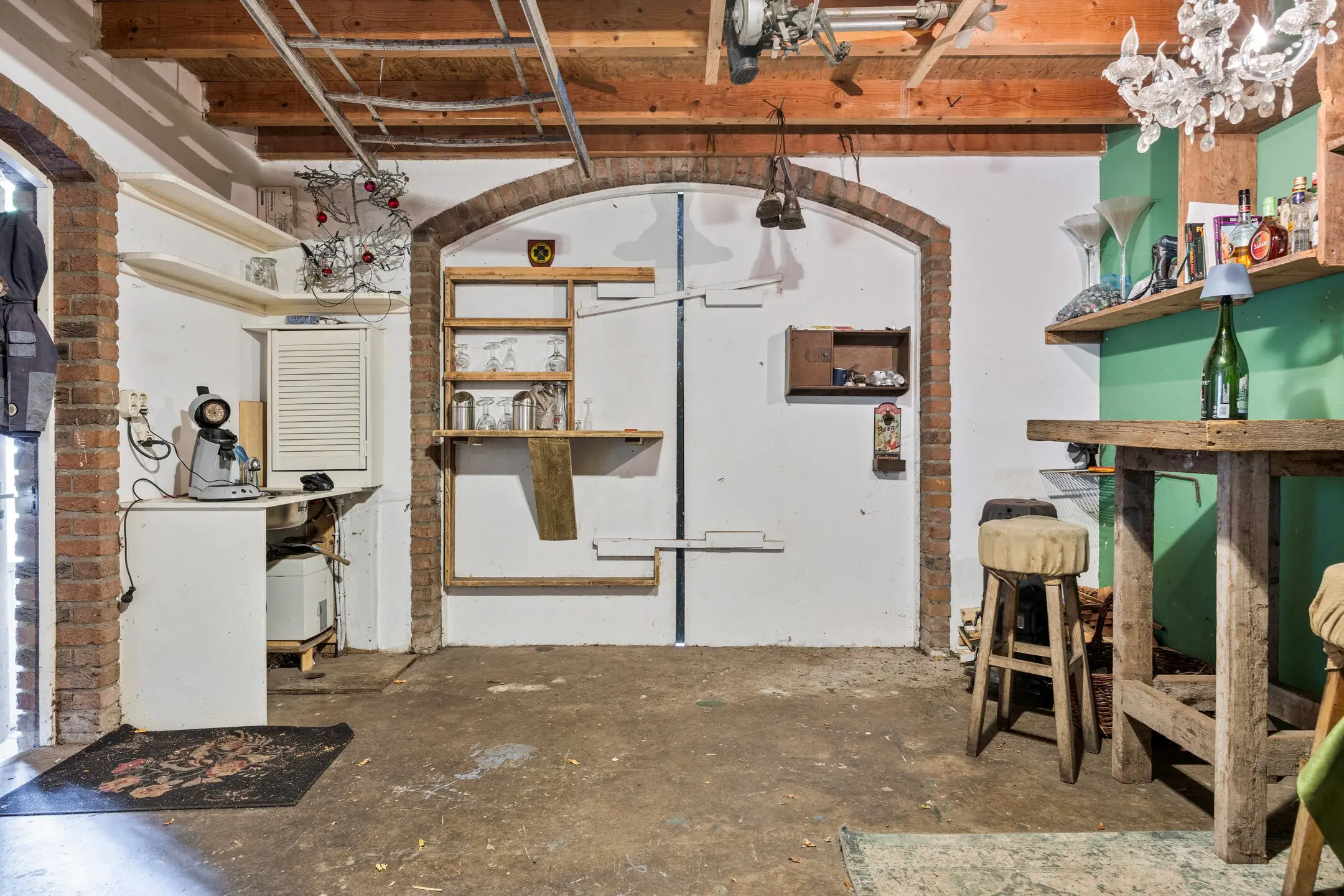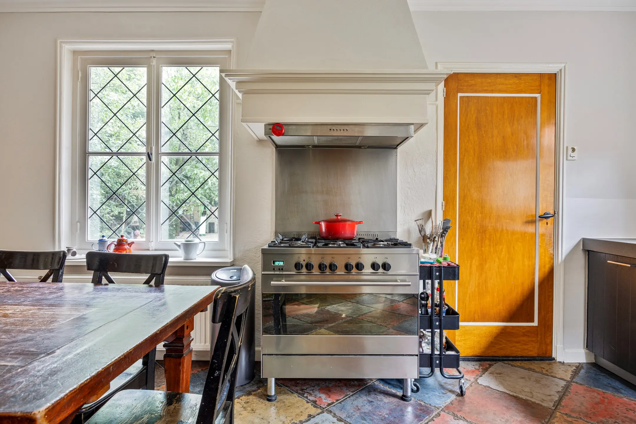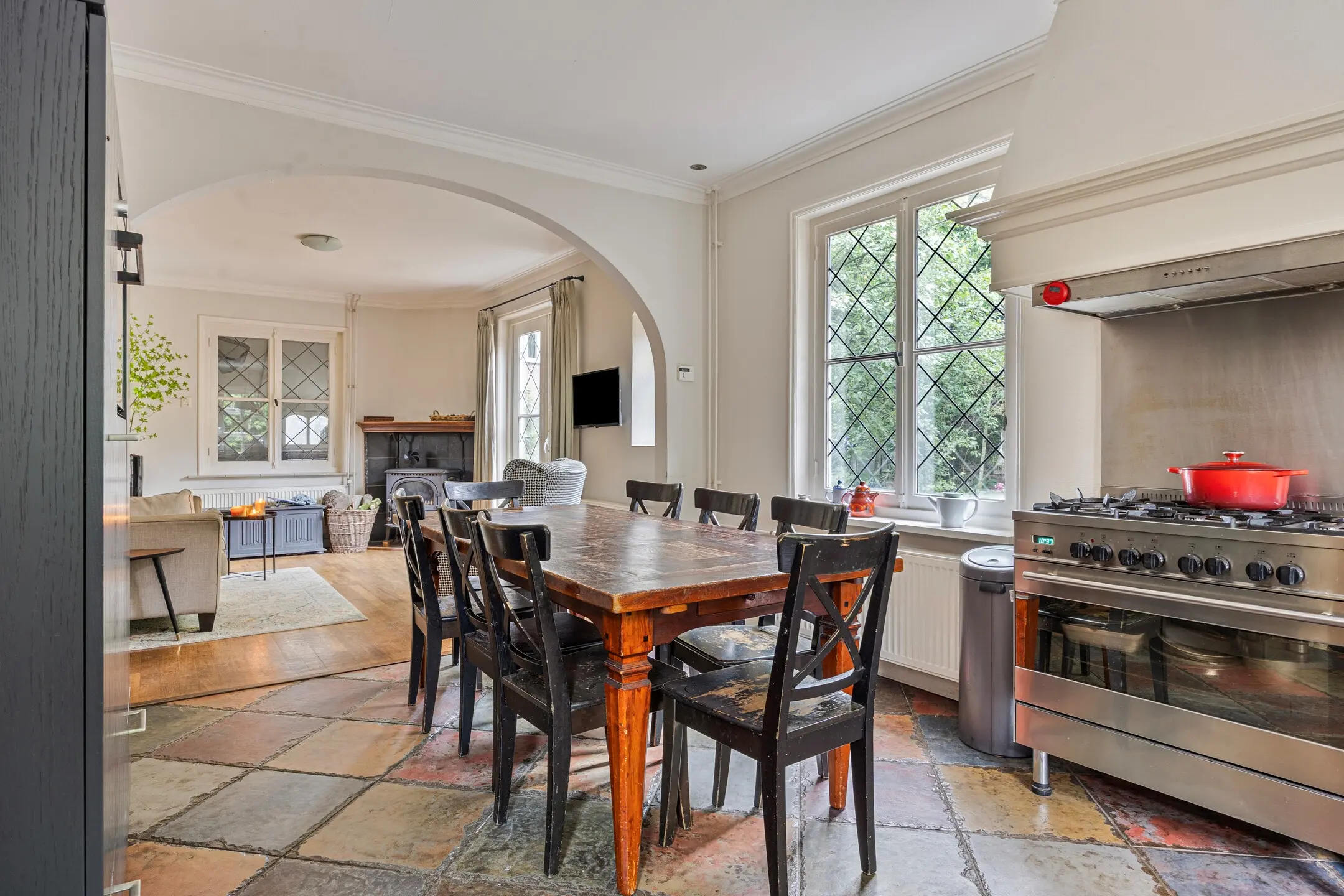 Dankzij de open verbinding met de eet-/zitkamer is dit een ideale plek om samen te koken, te tafelen en te genieten van het dagelijks leven. Een houtkachel voegt extra warmte en sfeer toe, terwijl de originele glas-in-loodramen het geheel een authentieke, bijna nostalgische uitstraling geven.
