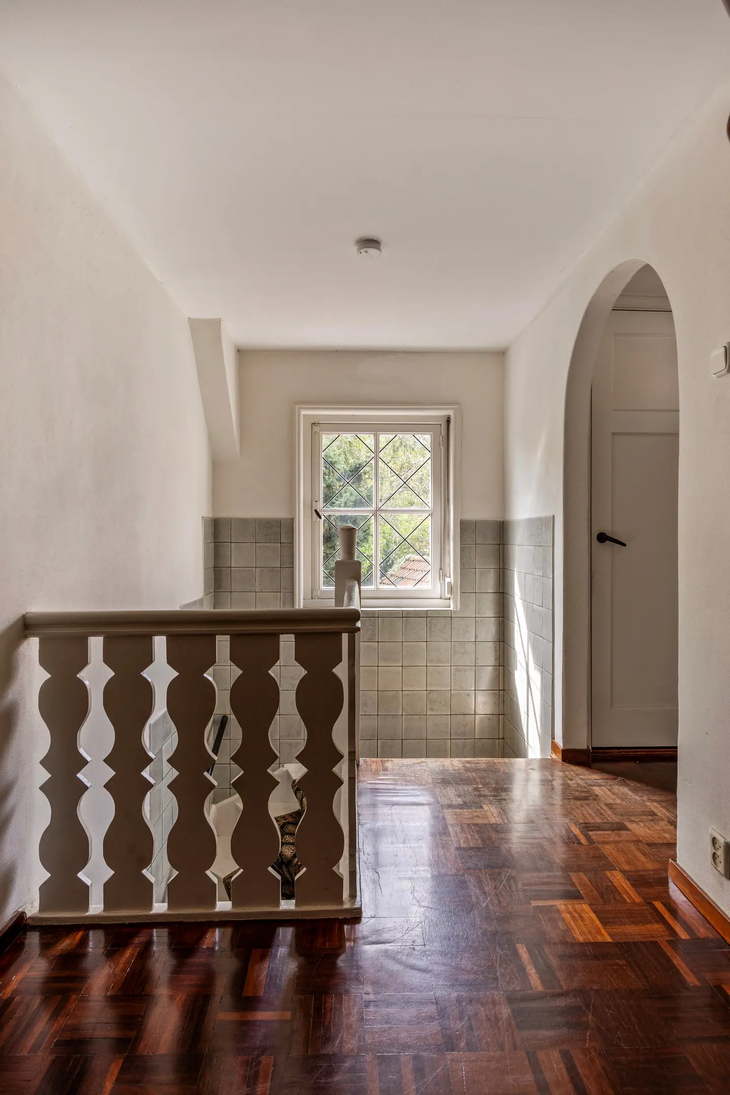 Via de vaste trap vanuit de entree bereikt u de overloop op de eerste verdieping. De ruimte oogt licht en ruimtelijk dankzij het glas-in-loodraam dat voor een warme lichtinval zorgt.