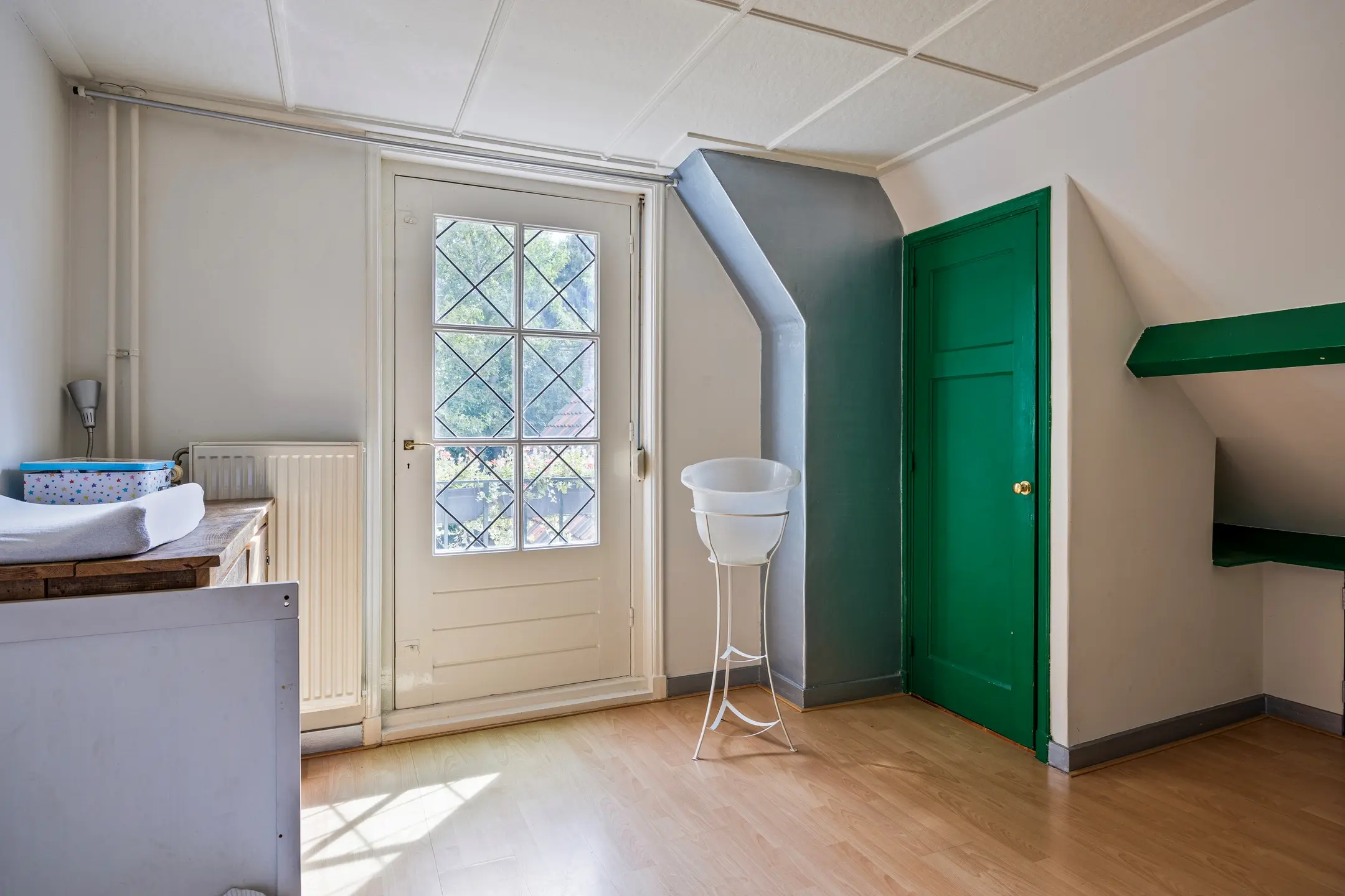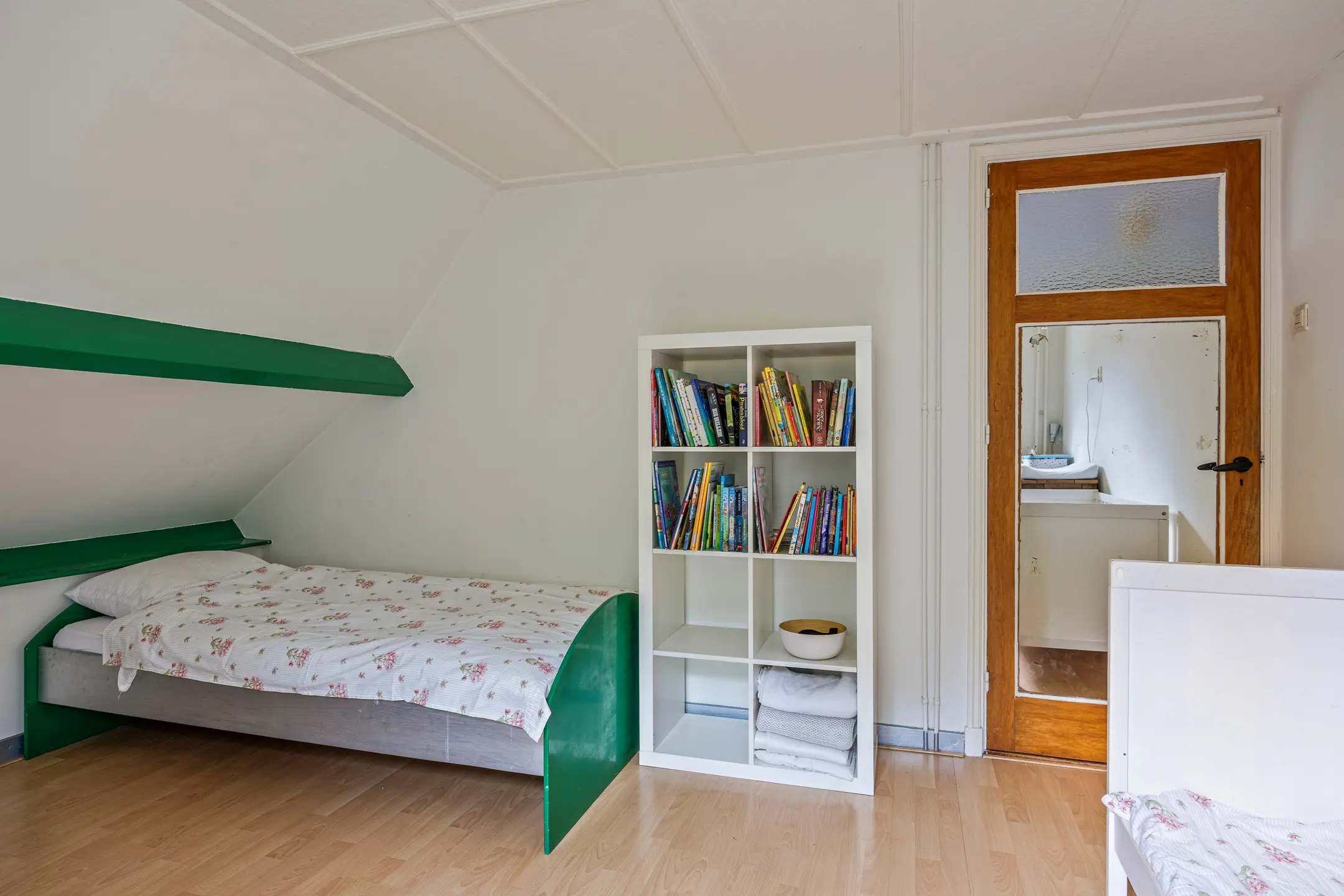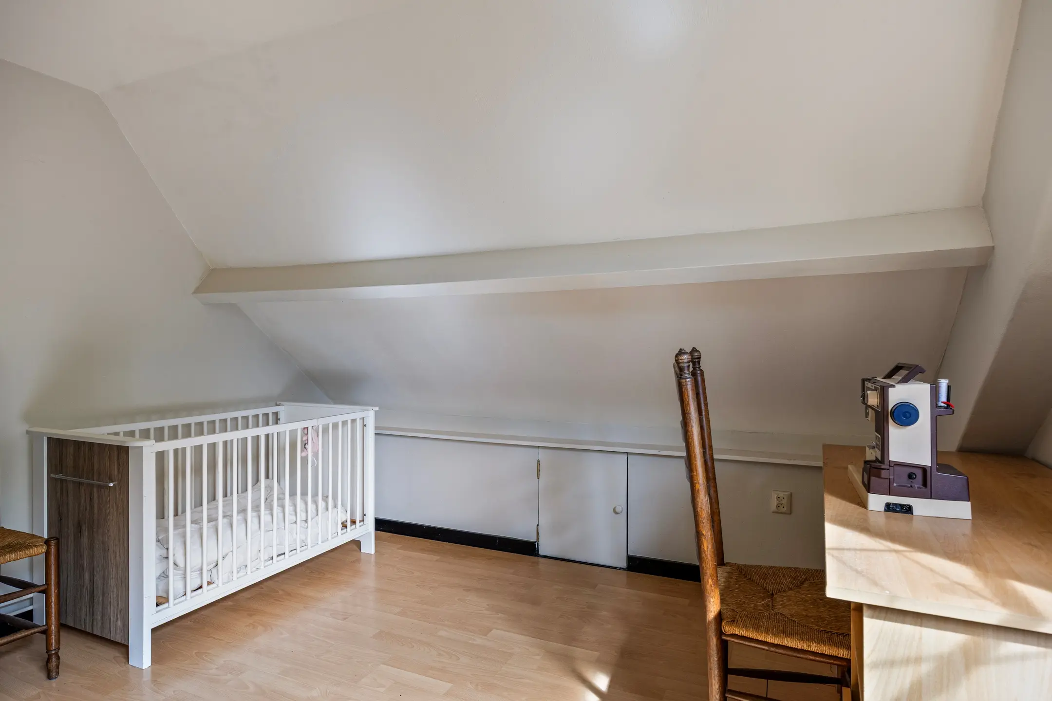 De overloop en één van de slaapkamers zijn voorzien van gestucte wanden en plafonds, terwijl de tweede slaapkamer is afgewerkt met gestucte wanden en een plafond met houten schrootjes. Beide kamers beschikken over laminaatvloeren en laten zich flexibel gebruiken: als logeerkamer, werkkamer, speelruimte of gewoon als extra bergruimte.