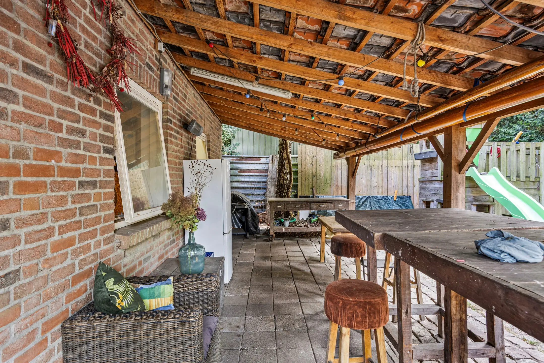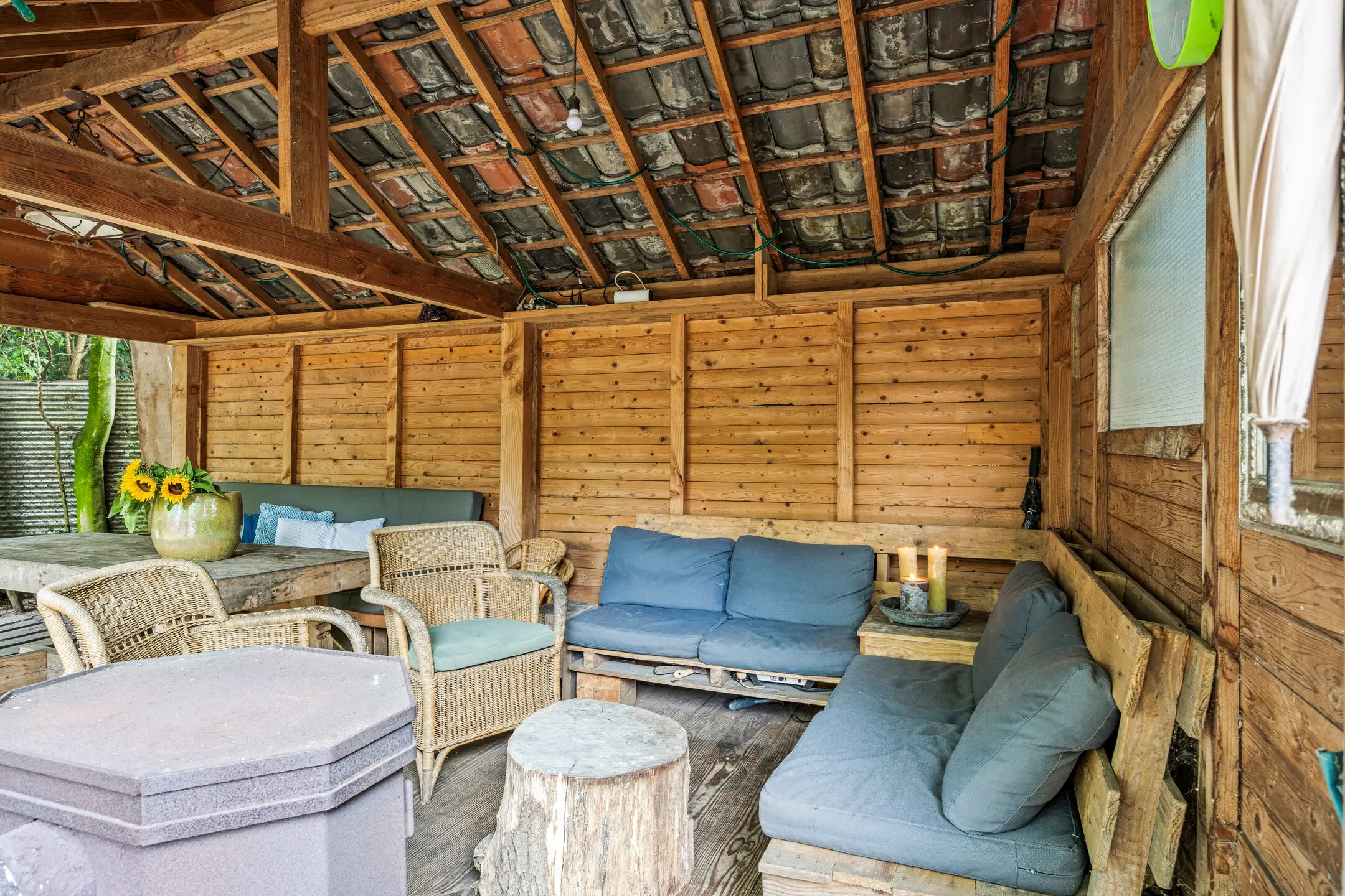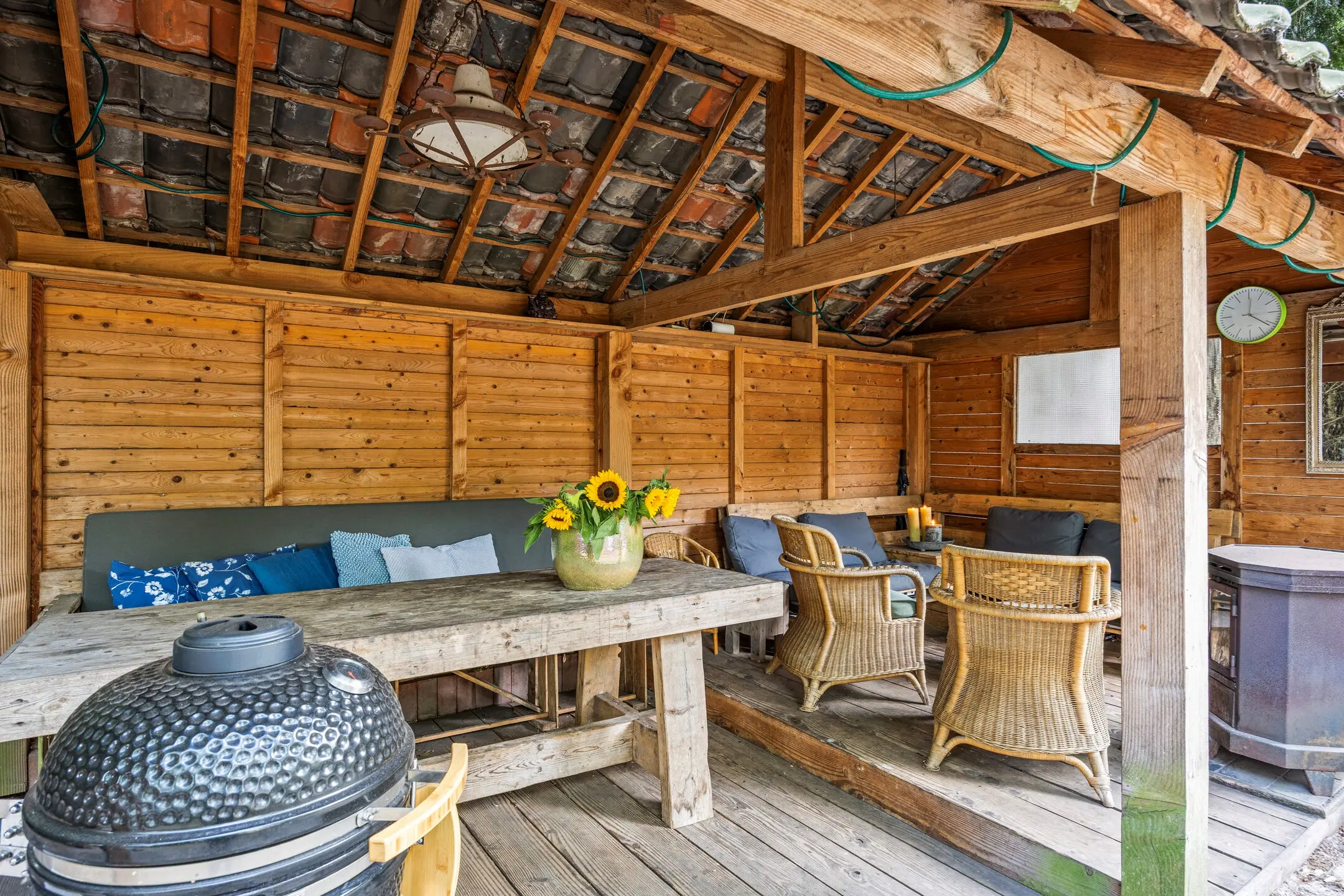 De ruime overkapping is een ware verlenging van het woongenot. Voorzien van elektra en een houtkachel is dit een plek waar u het hele jaar door comfortabel kunt vertoeven – van knusse winteravonden tot lange zomerse diners. Daarnaast is er een praktische, vrijstaande houtopslag aanwezig.