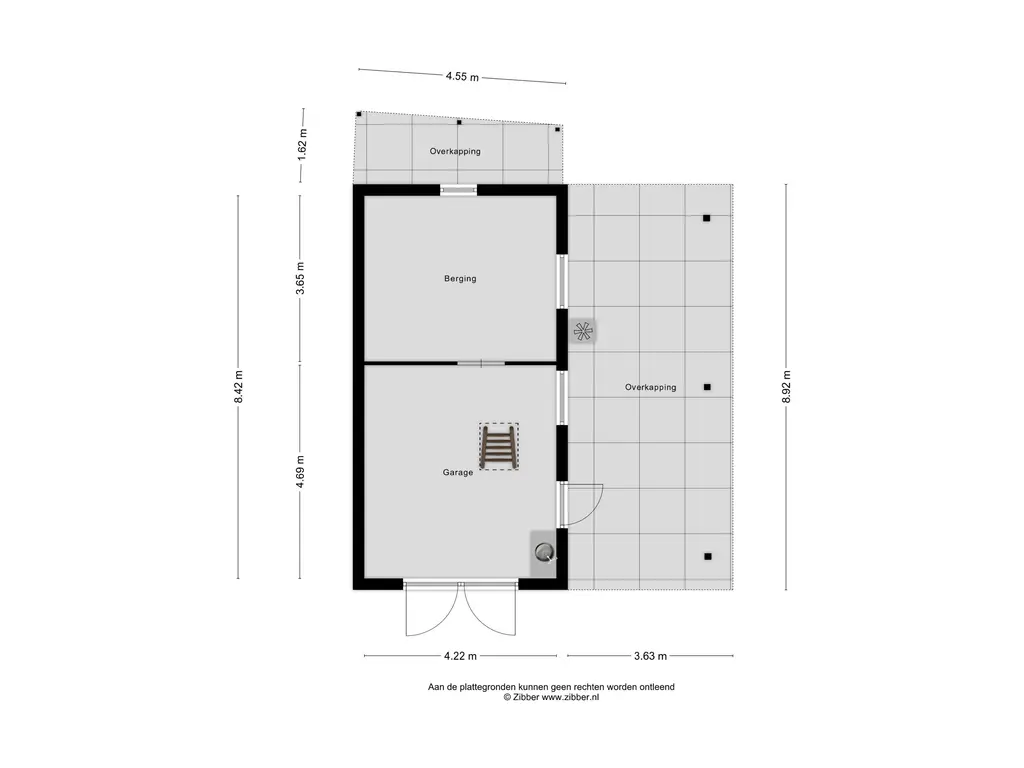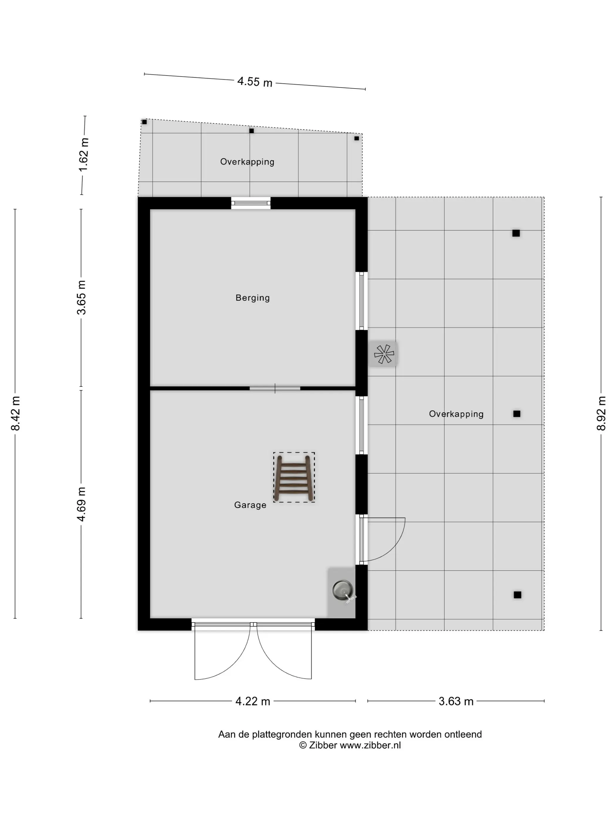 De garage is voorzien van een praktische zolder, bereikbaar via een vlizotrap – perfect voor het opslaan van materialen of seizoensgebonden spullen. Aansluitend bevindt zich een gezellige overkapping die extra gebruiksmogelijkheden biedt, bijvoorbeeld als buitenwerkplaats of als beschutte plek om te ontspannen.