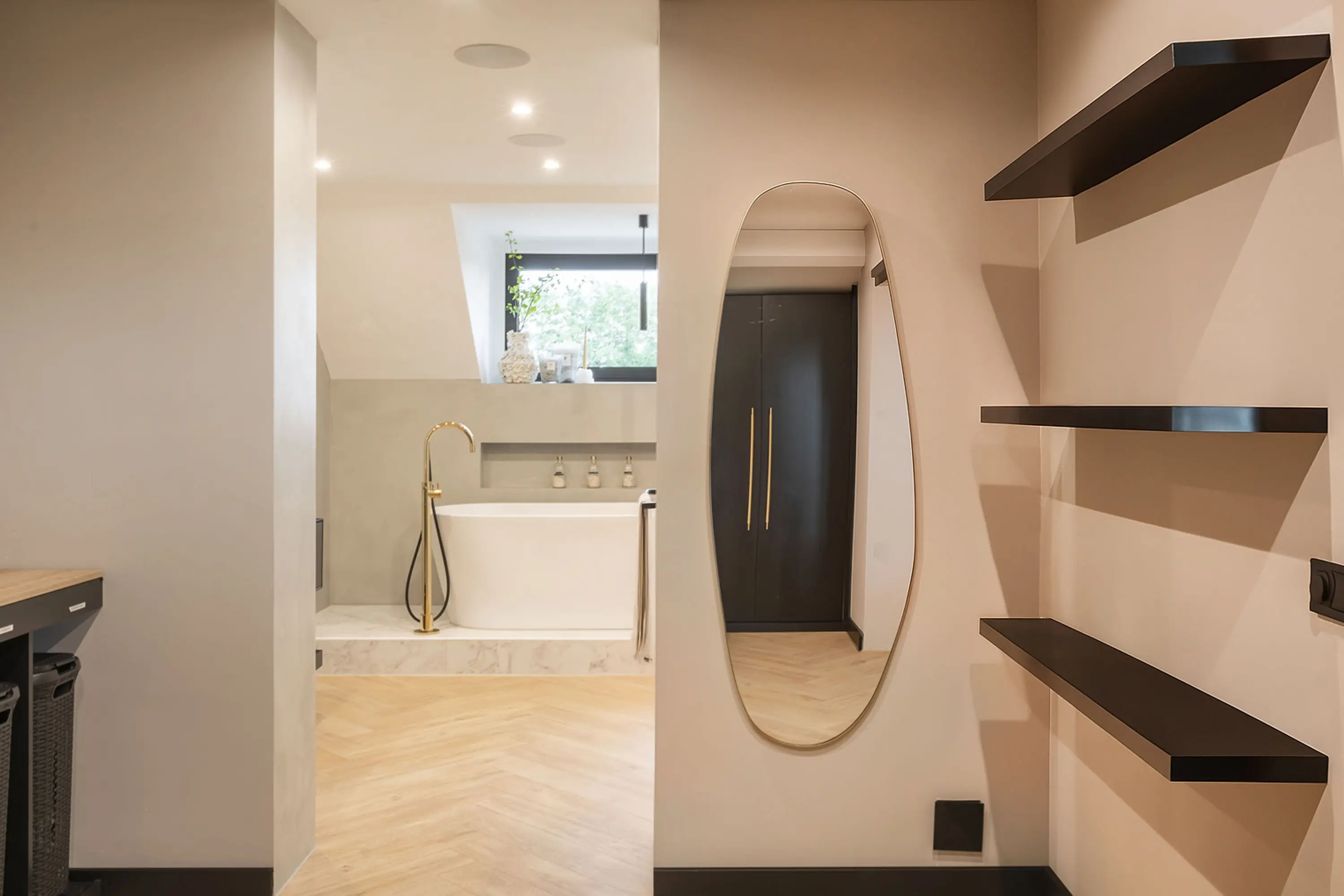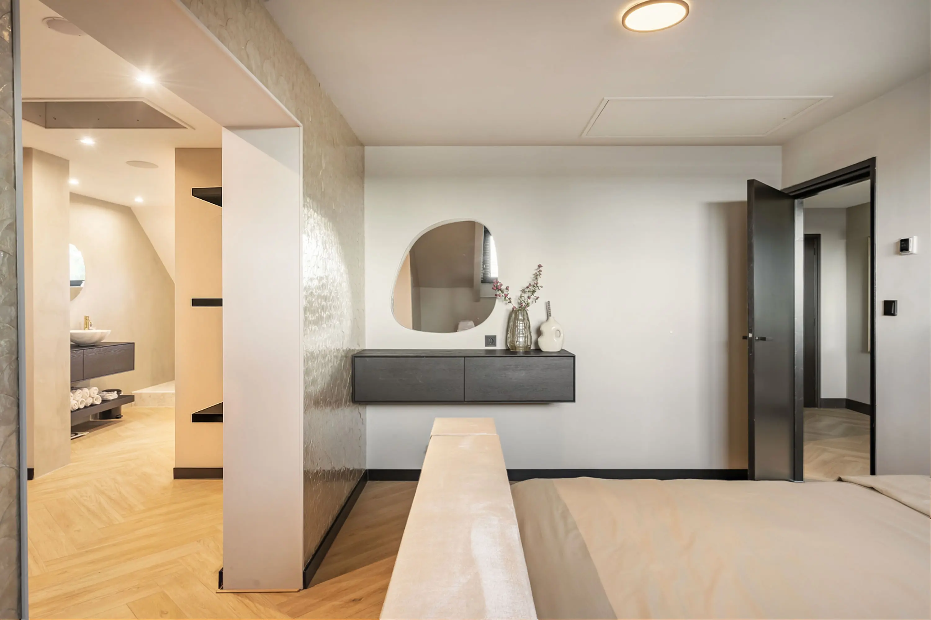 De en-suite badkamer combineert elegantie met wellness. Uitgevoerd met een visgraat-tegelvloer, betonsiré en luxe tegelwerk, een vrijstaand ligbad, maatwerkmeubel met dubbele wastafel en een royale duo-inloopdouche met geïntegreerde sunshower en muzieksysteem.