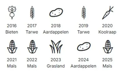 Het dijkperceel en grasland is altijd al in gebruik als akkerrand en grasland. Het perceel cultuurgrond tegen de Bosseweg aan is in gebruik als bouwland. De afgelopen jaren zijn de volgende gewassen op het bouwland geteeld: bieten, tarwe, aardappelen, koolraap, maïs en grasland.