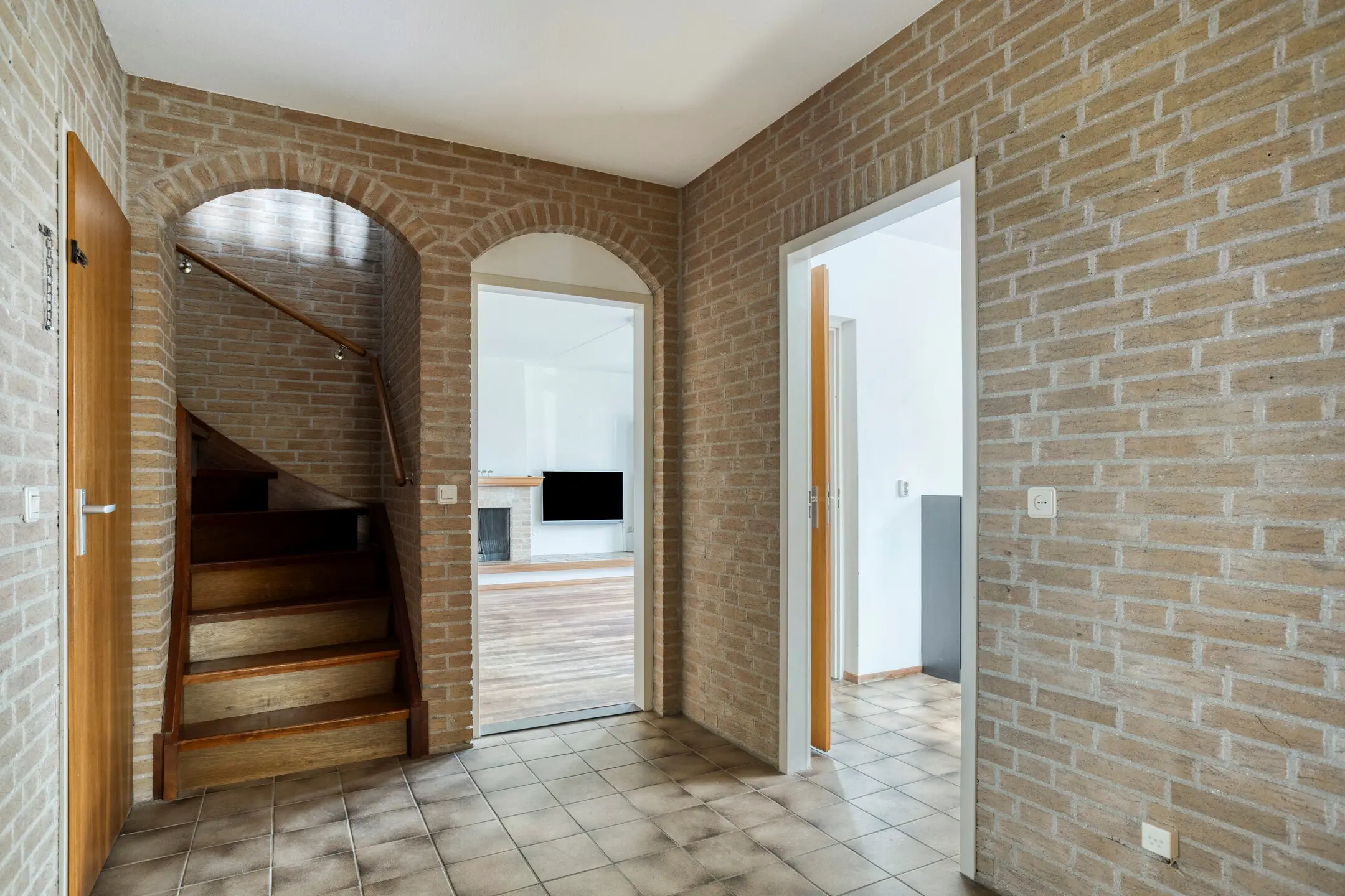 De entree geeft toegang tot de keuken, woonkamer, toiletruimte en bijkeuken. Daarnaast bevindt zich hier de vaste trapopgang richting de eerste verdieping. De vloer is afgewerkt met tegels, de muren zijn afgewerkt met metselwerk en het plafond is afgewerkt met stucwerk. De meterkast bevindt zicht tegenover de toiletruimte (3x 25A + een slimme meter). Ongeveer 50 cm onder de trap is een kelderkast aanwezig.