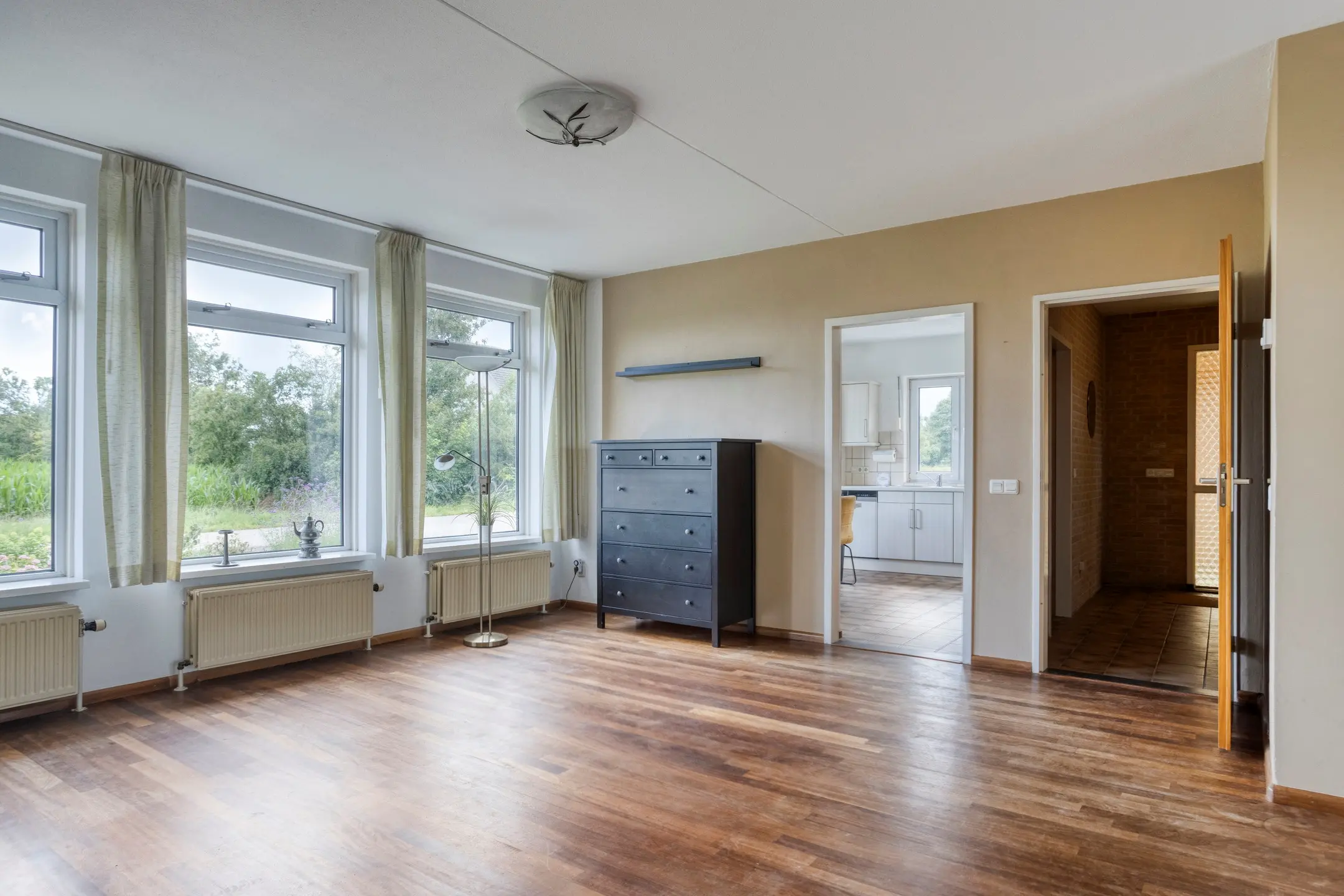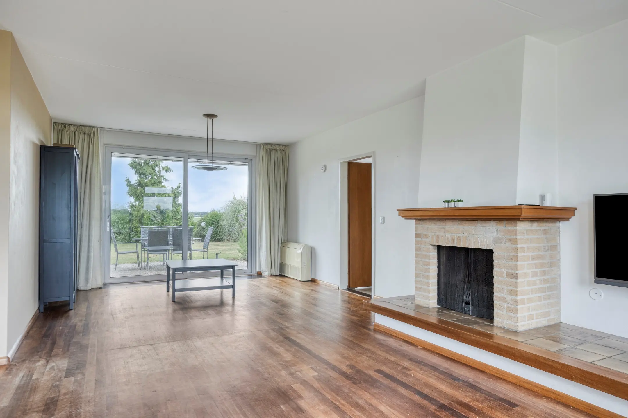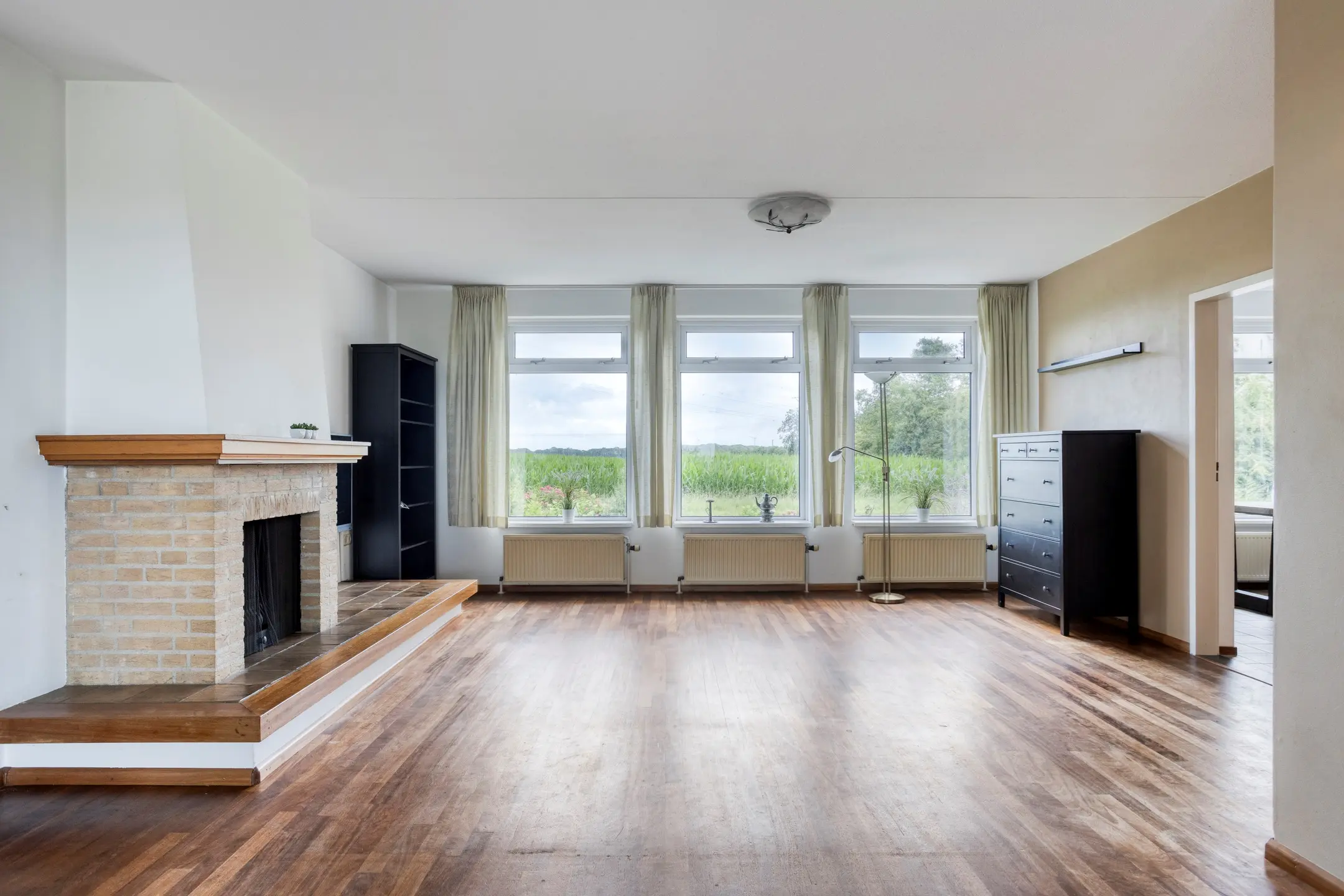 De ruime woonkamer is tuingericht en de grote raampartijen zorgen voor een prettige lichtinval met uitzicht op het groen rondom. De vloer is voorzien van een parketvloer, de wanden en het plafond zijn afgewerkt met stucwerk. Verwarming geschiedt middels een radiator en de schouw met open haard zorgt, naast verwarming, voor een warme uitstraling. In deze ruimte is een Remeha thermostaat bevestigd.
