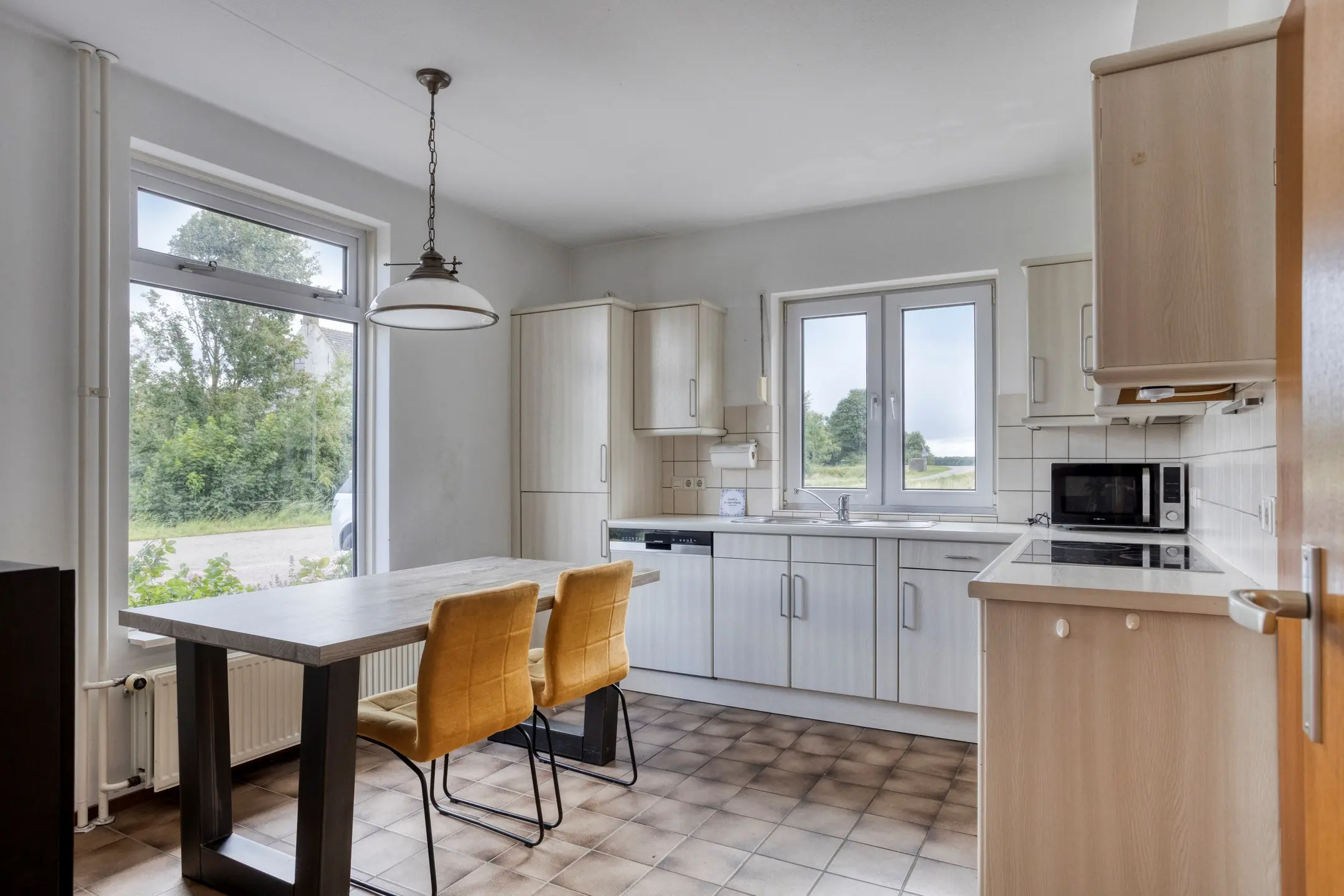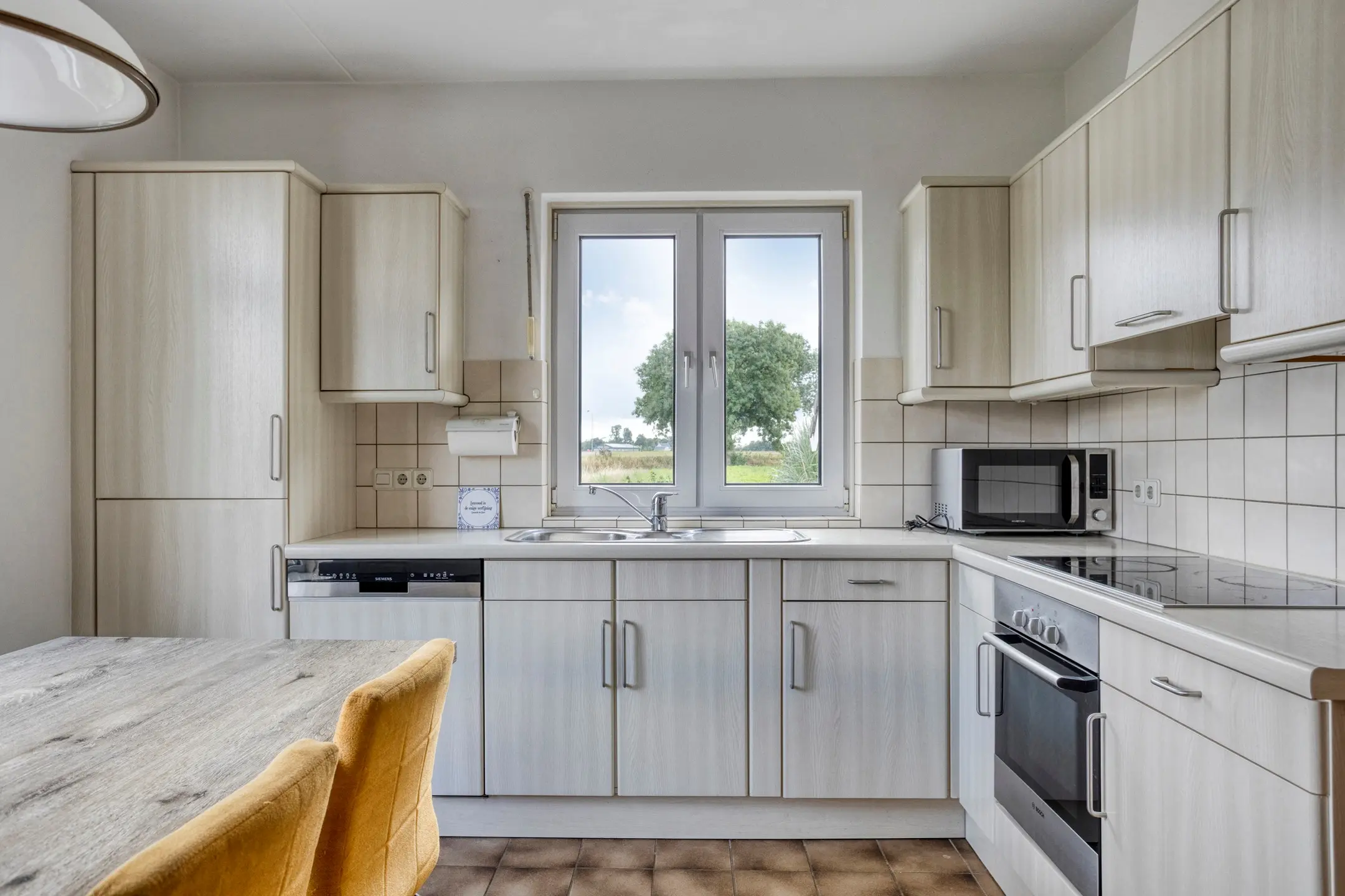Aan de voorzijde van de woning bevindt zich de keuken, deze is vanuit zowel de entree als de woonkamer te betreden. De vloer is afgewerkt met tegels en de wanden zijn deels betegeld en deels voorzien van stucwerk. Het plafond is met stucwerk afgewerkt. De keuken is geplaatst in een L-opstelling en ingericht met 1,5 spoelbak, inductie kookplaat (Miele), afzuigkap, oven (Bosch), vaatwasser (Siemens), koel-/vries combinatie. Ook is er voldoende ruimte voor een eettafel, zodat er gezellig getafeld en geborreld kan worden met het gezin, familie of vrienden. Verwarming geschiedt middels een radiator en de kunststof kozijnen zijn voorzien van dubbel glas.