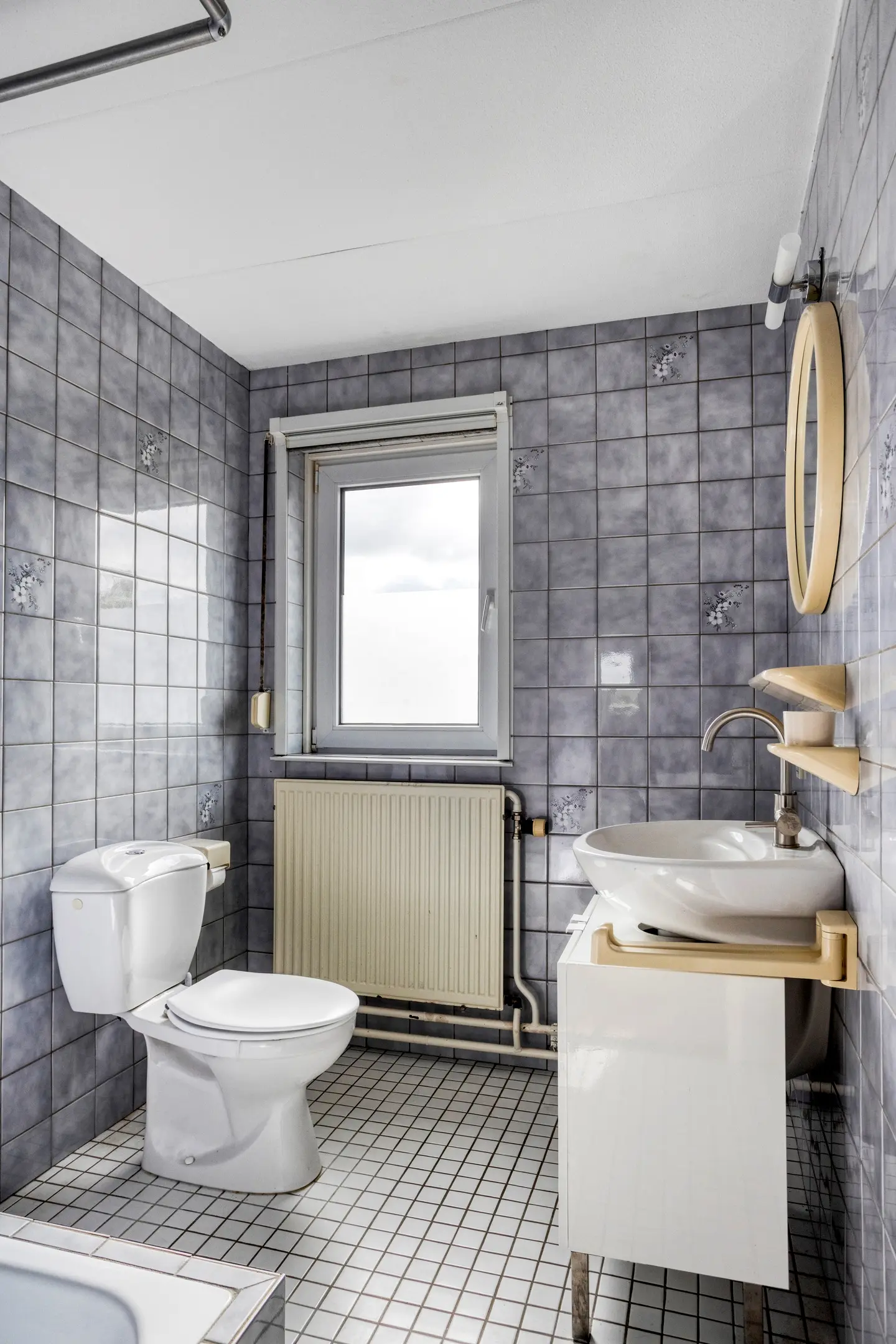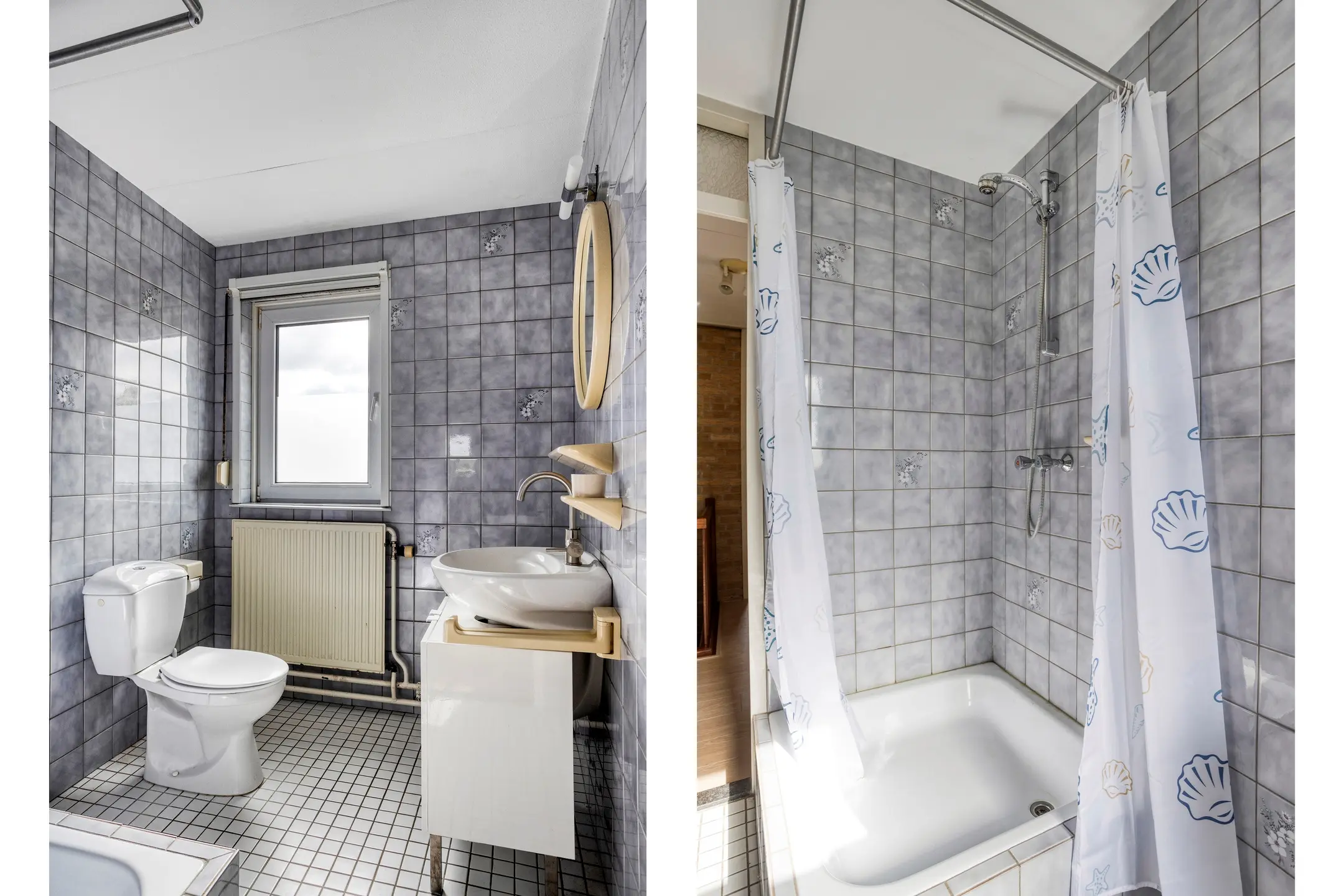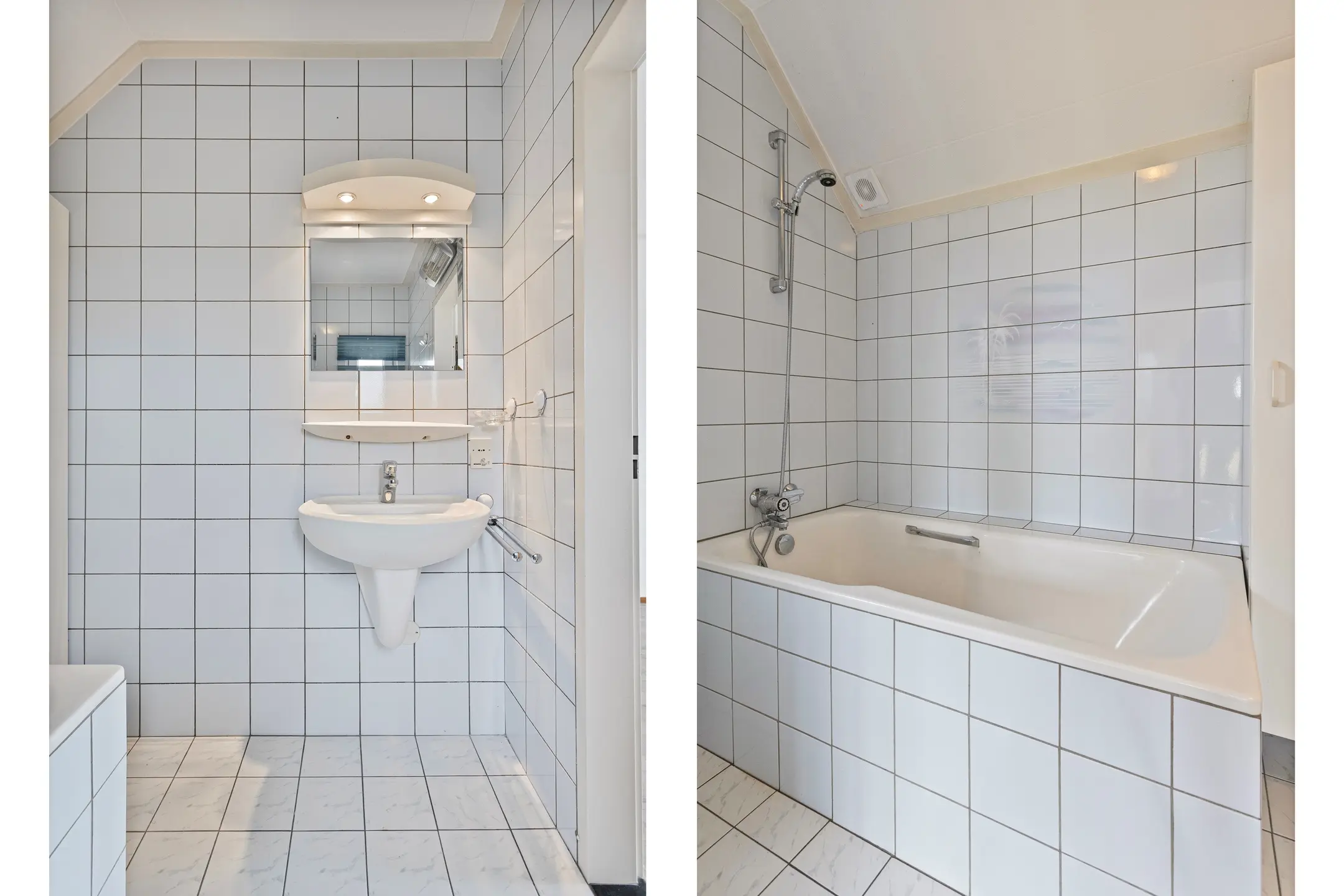 De badkamer is functioneel ingericht met een bad met douchemogelijkheid, wastafel en toilet. De vloer is afgewerkt met tegels, het grootste gedeelte van de wanden is afgewerkt met tegels en deels met stucwerk. Het plafond is afgewerkt met stucwerk. Aan de wand naast het bad is een kast bevestigd. Verwarming geschiedt middels de aanwezige radiator. Afzuiging is aanwezig.