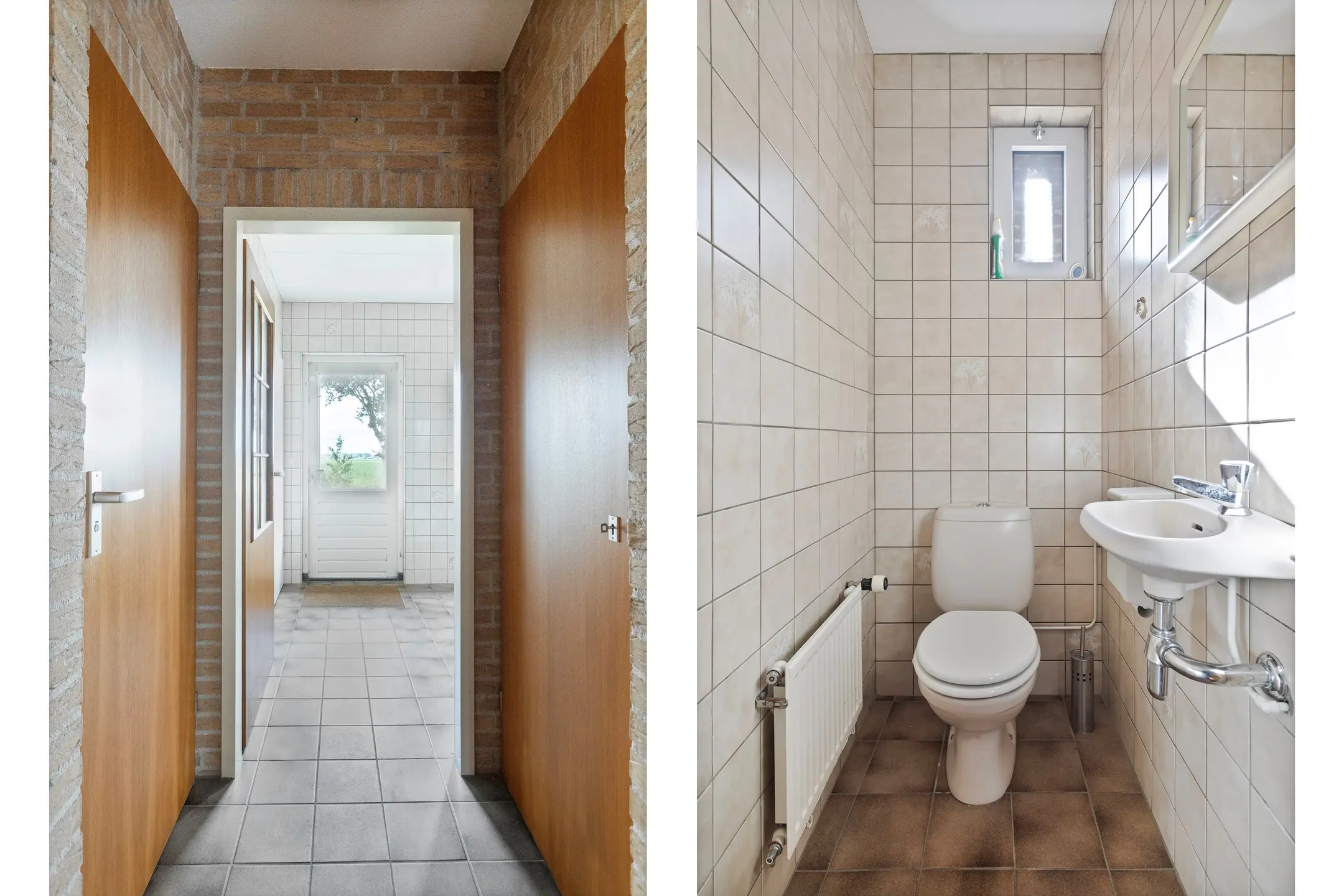 De toiletruimte is geheel betegeld, heeft een stucwerk plafond en is ingericht met een staand toilet en fonteintje. Verwarming is aanwezig (radiator).