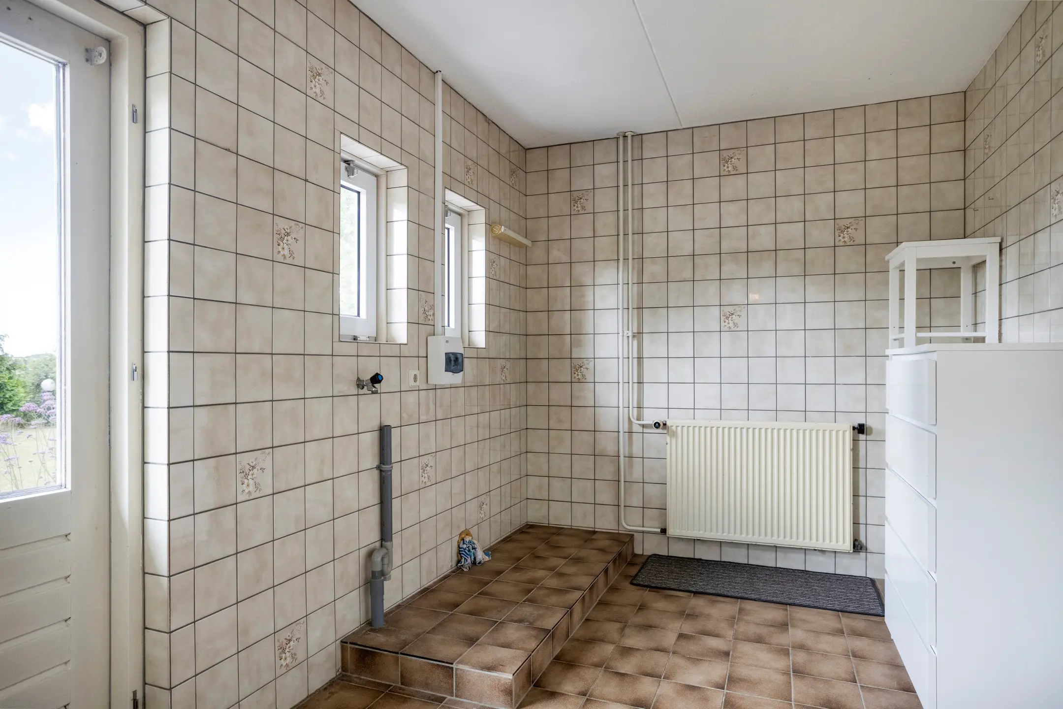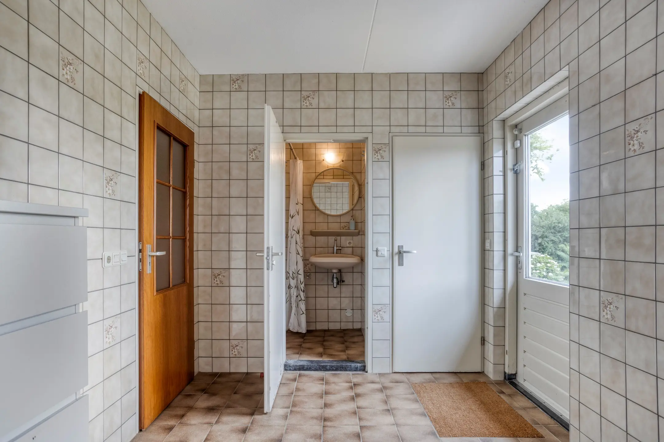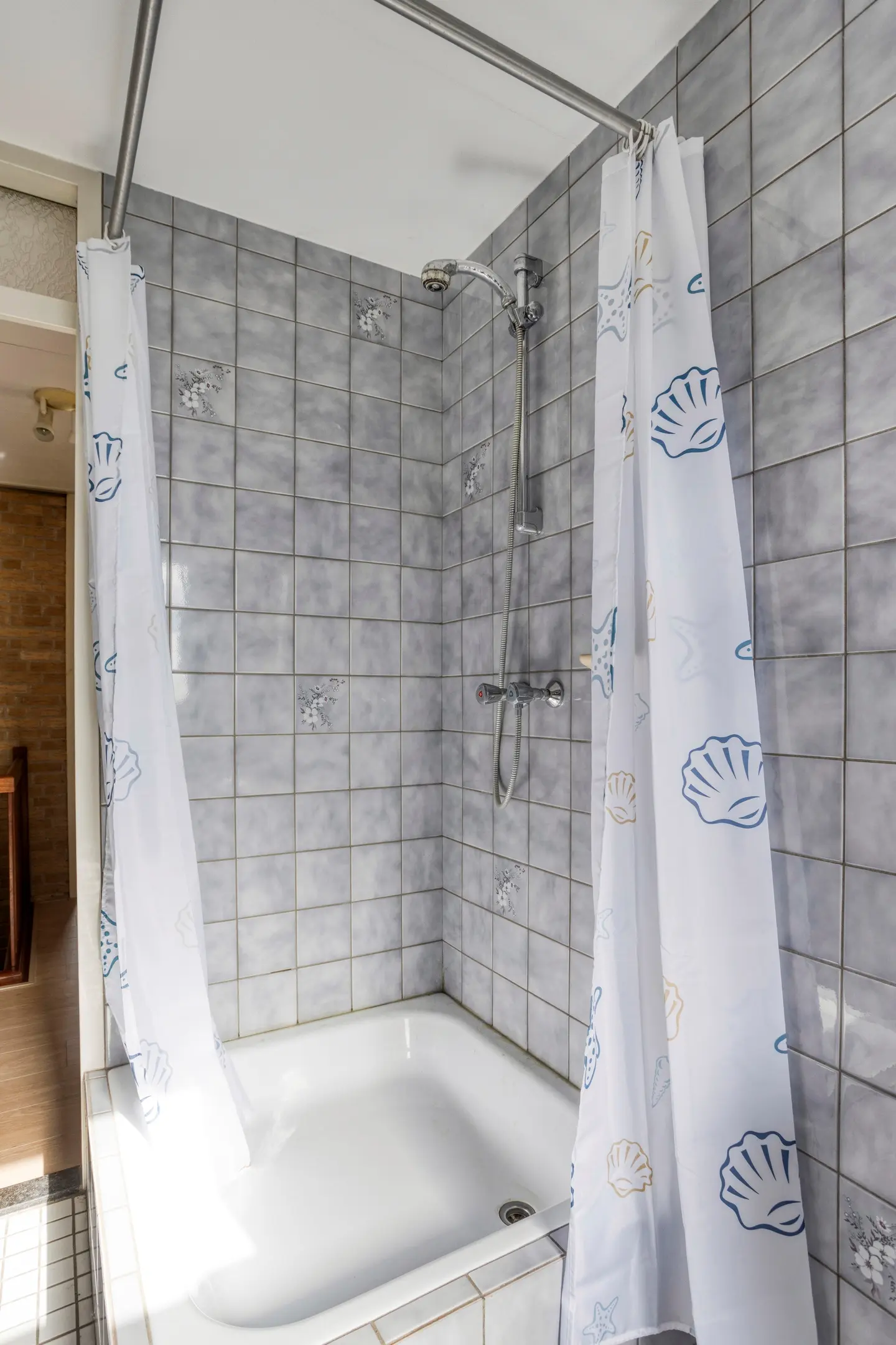 Vanuit de bijkeuken is er toegang tot de badkamer, welke geheel is betegeld. Het is een praktische badkamer met een inloopdouche en wastafel.