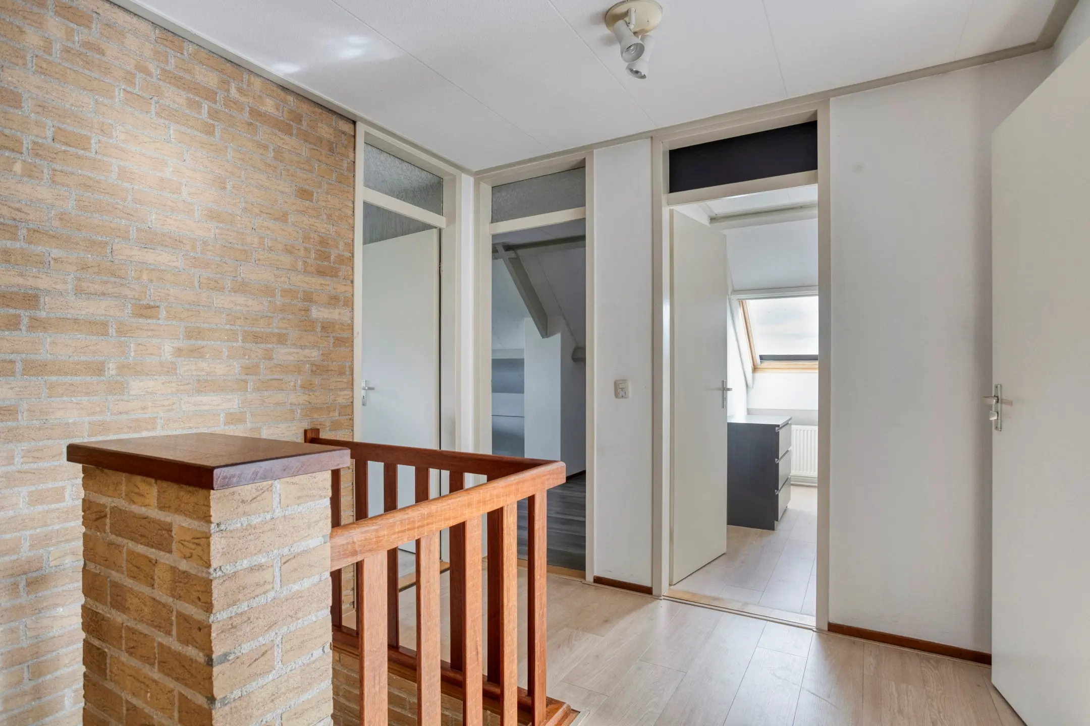 Een vaste trap gelegen in de entree leidt naar de eerste verdieping, waar u terechtkomt op de overloop. De vloer is afgewerkt met laminaat, de wanden zijn afgewerkt met schoonmetselwerk en het plafond is afgewerkt met plafondplaten.