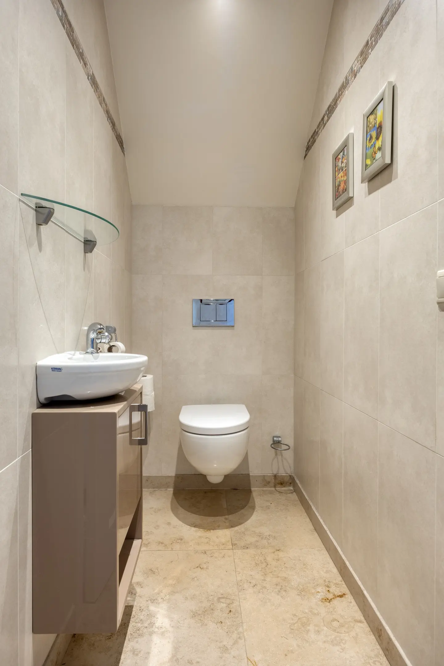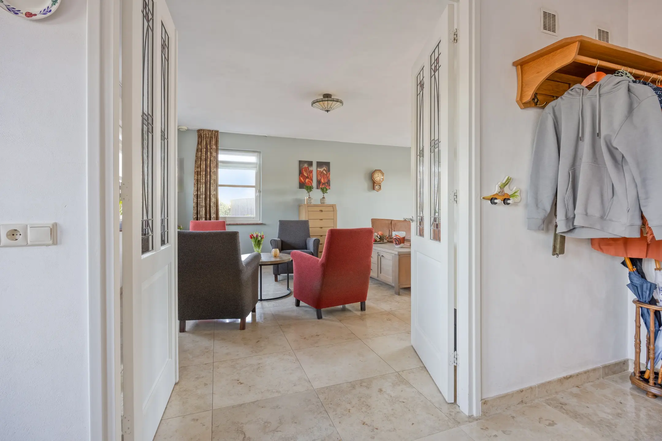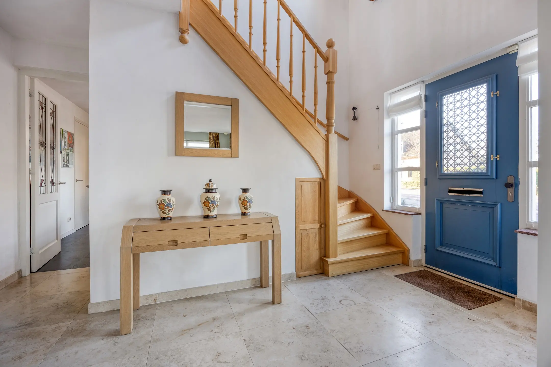 Via de voordeur betreed je de ruime en verzorgde entree van de woning. De hal vormt het centrale punt van de begane grond en geeft toegang tot het toilet, de woonkamer, de multifunctionele ruimte en de trapopgang naar de eerste verdieping. De begane grond is strak en tijdloos afgewerkt met gestucte wanden en plafonds en een natuurstenen tegelvloer met vloerverwarming.