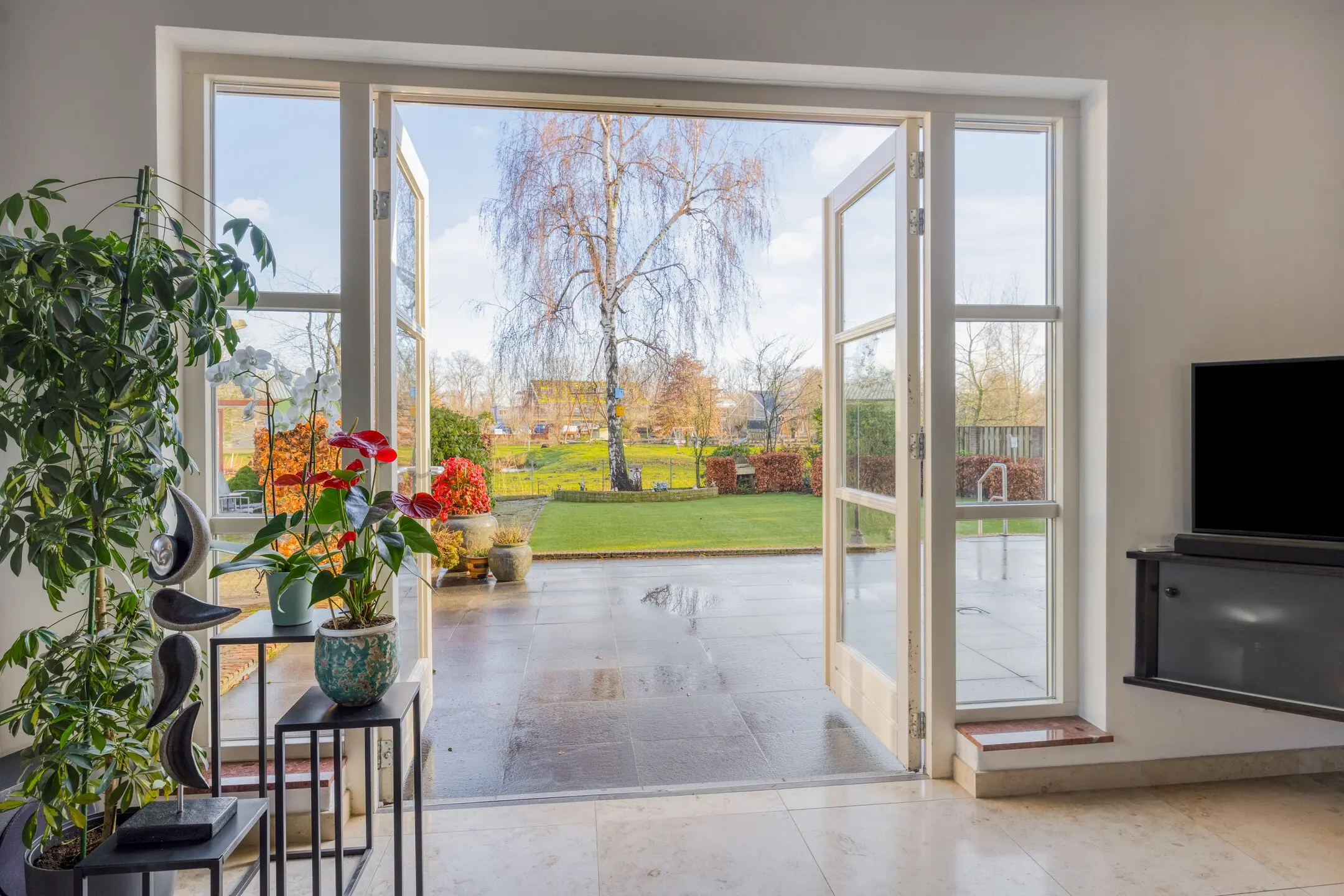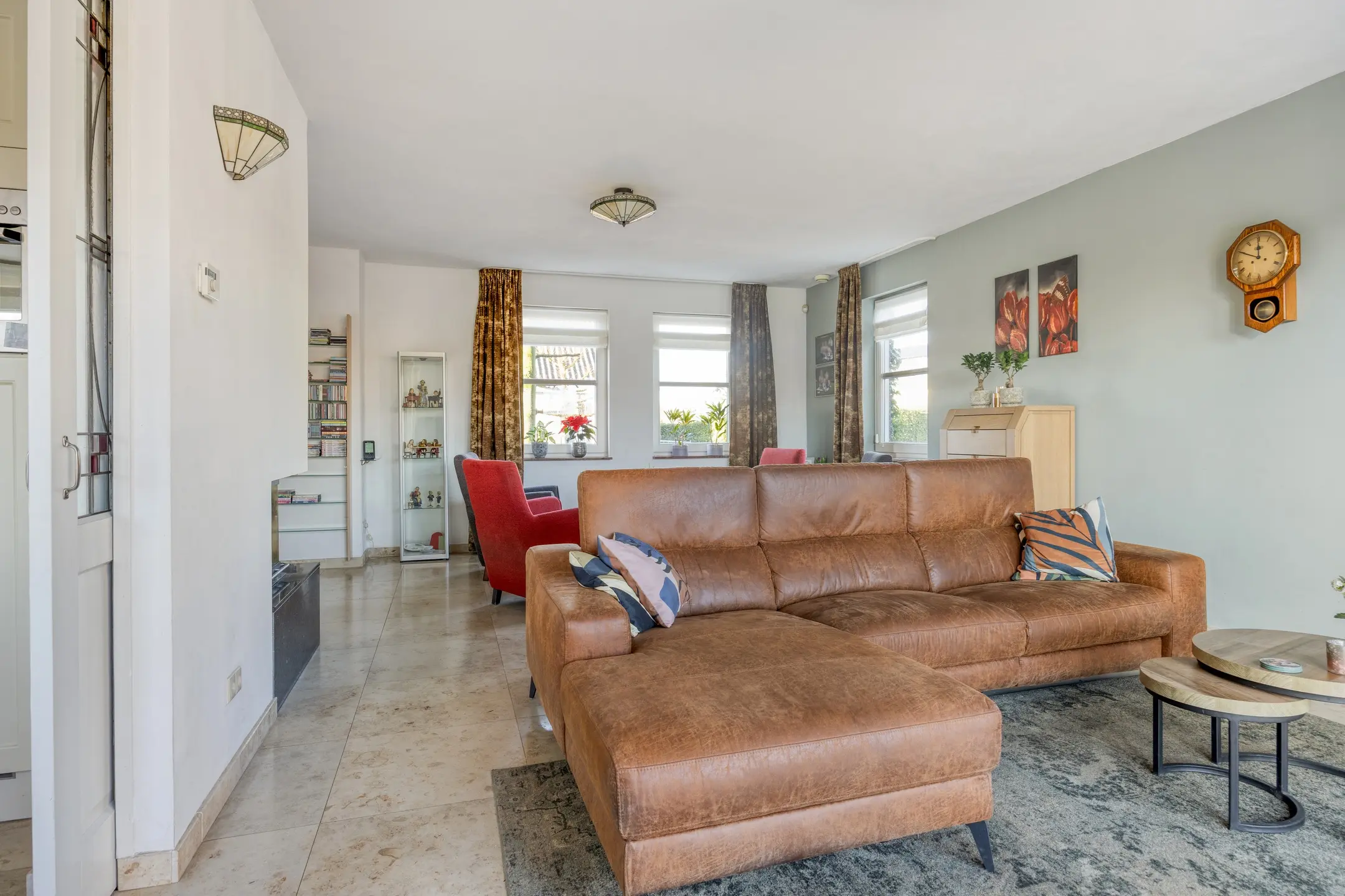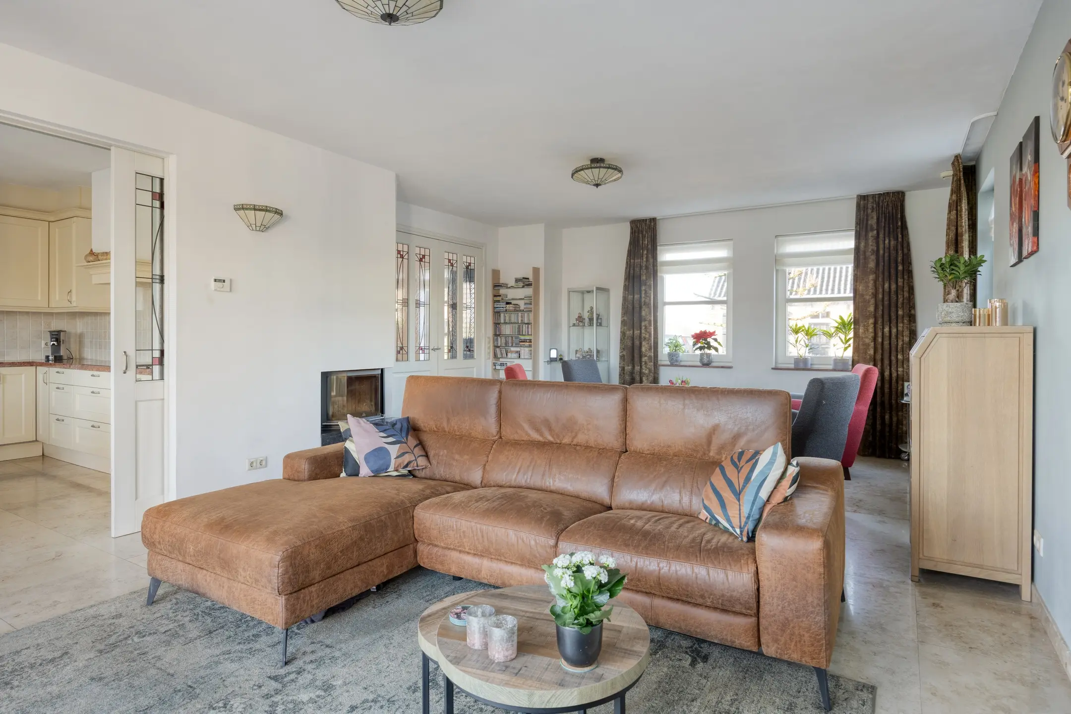 Via stijlvolle en-suite deuren staat de woonkamer in open verbinding met de keuken, waardoor de ruimtes zowel samen als afzonderlijk prettig te gebruiken zijn.