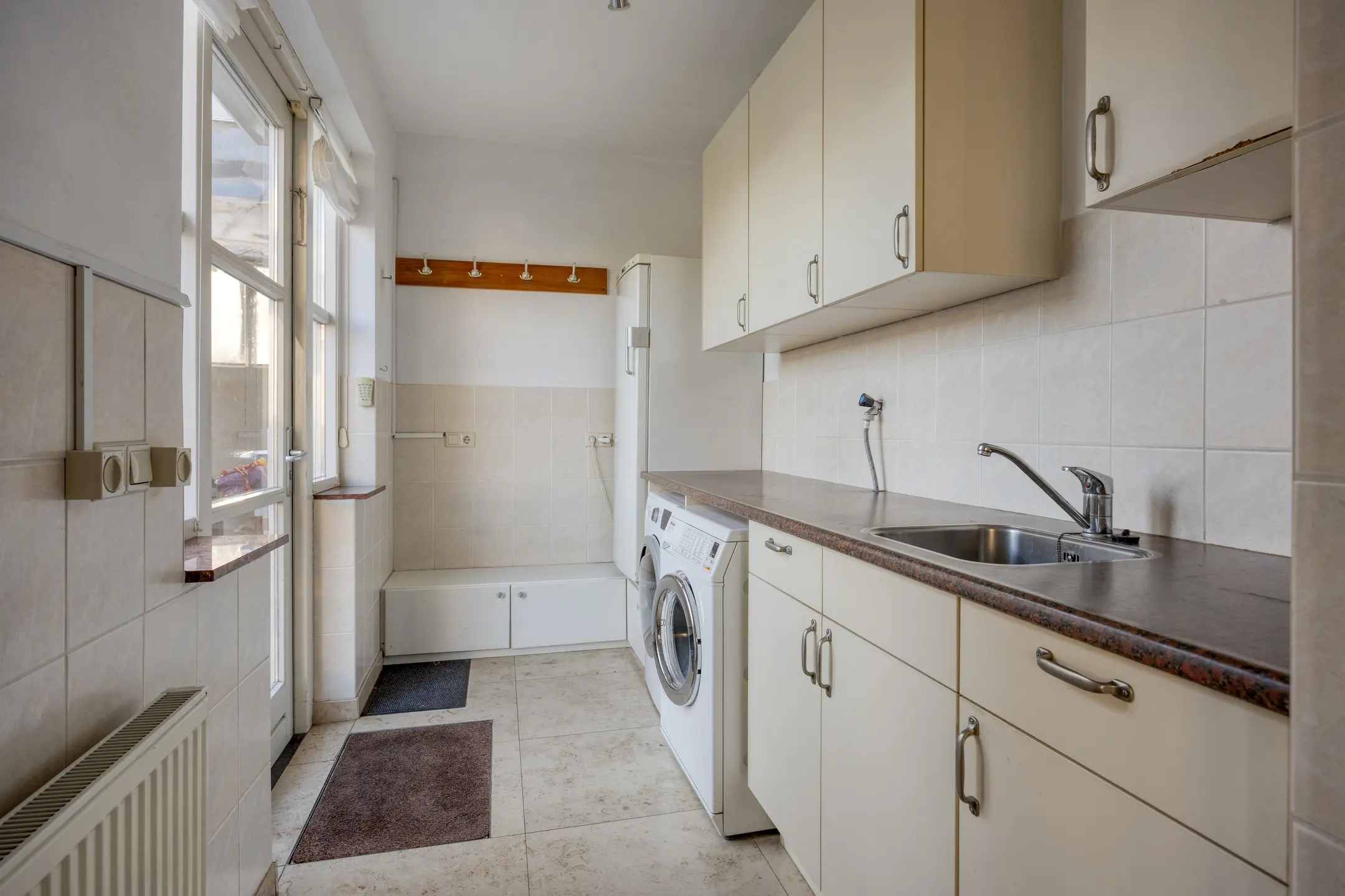 Aansluitend aan de keuken bevindt zich de bijkeuken, een praktische ruimte die is ingericht met witgoedaansluitingen, een keukenblok met spoelbak. Vanuit hier is er directe toegang tot de tuin, wat de bijkeuken tot een functionele schakel maakt tussen binnen en buiten.