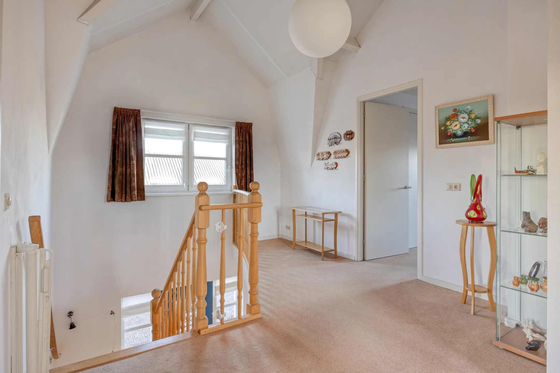 Via de vaste trap bereik je de eerste verdieping. De overloop met vide vormt een prettige en open ruimte en geeft toegang tot drie slaapkamers en de badkamer. De overloop is afgewerkt met vloerbedekking en beschikt, net als de rest van de verdieping, over gestucte wanden en plafonds, wat bijdraagt aan een rustige uitstraling.