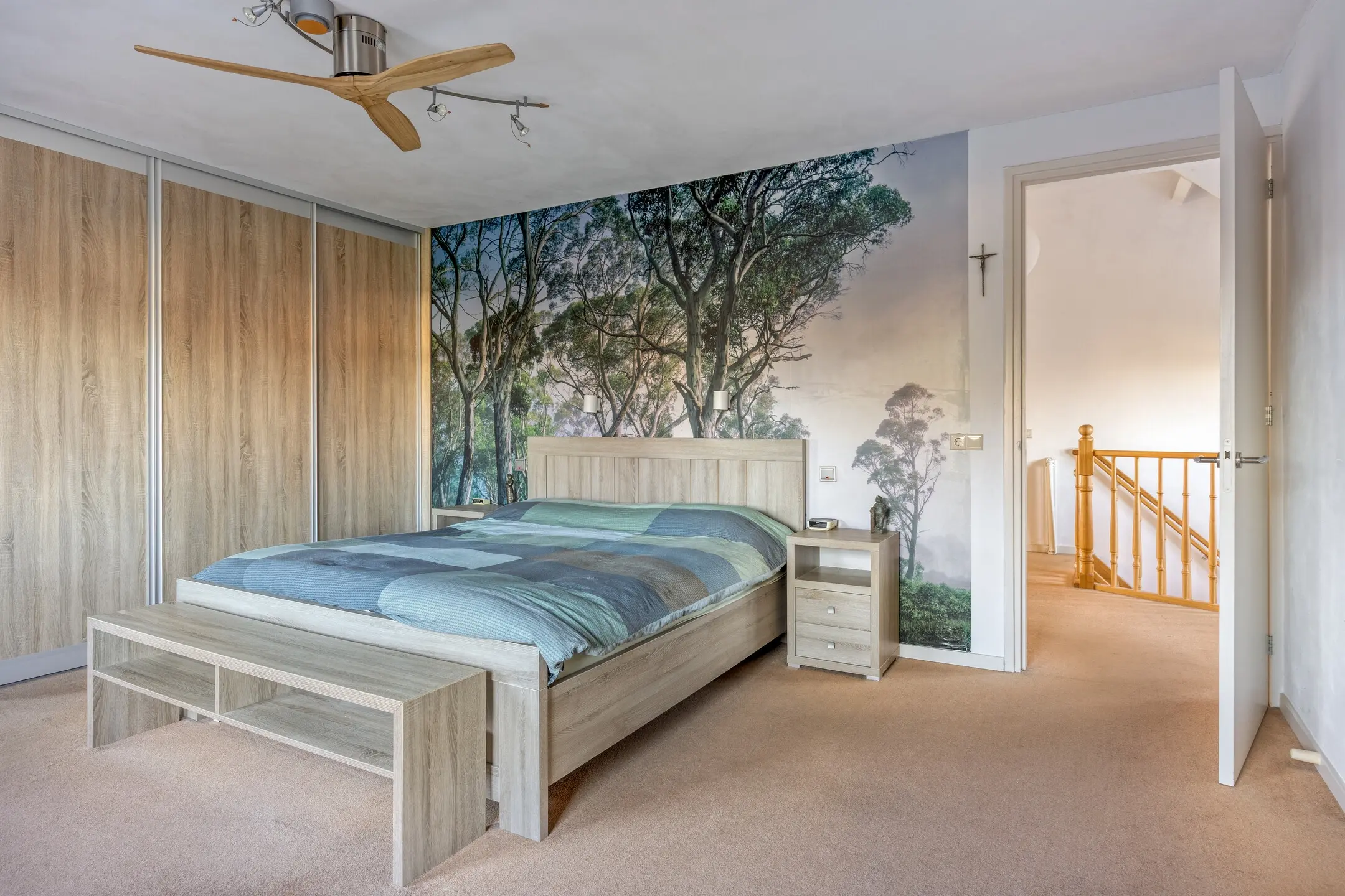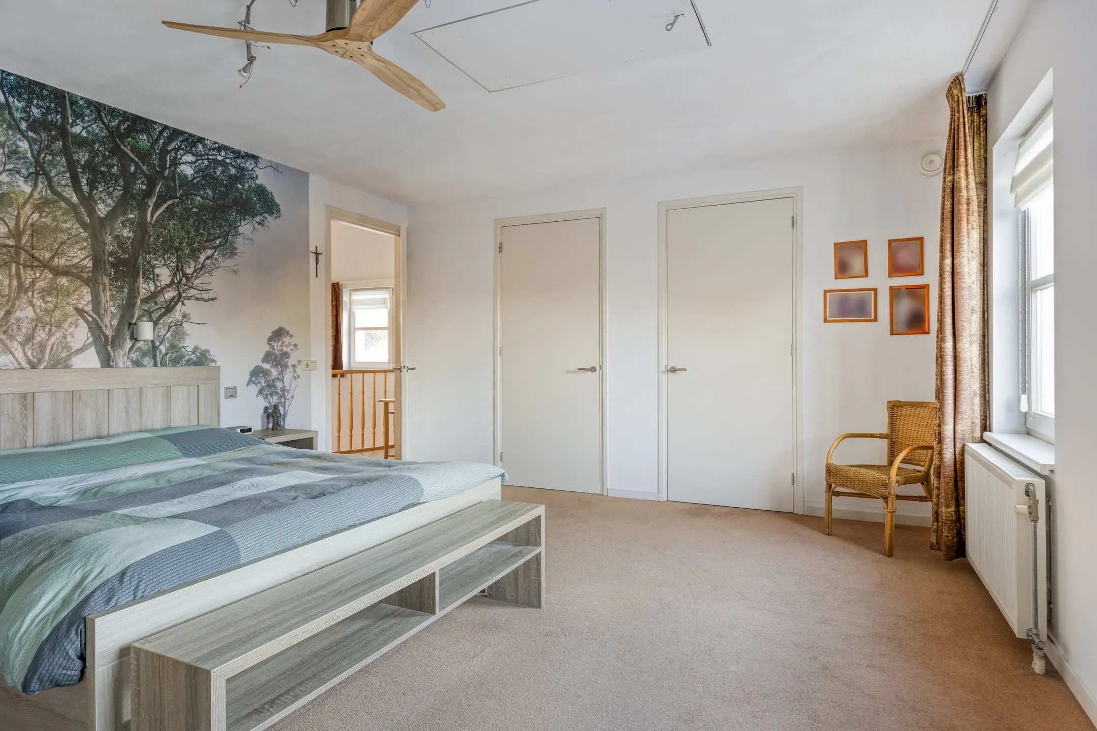 De master bedroom is royaal van opzet en voorzien van vloerbedekking, twee inloopkasten en een op maat gemaakte kastenwand. Via een luik is de bergzolder bereikbaar, wat extra praktische bergruimte biedt.