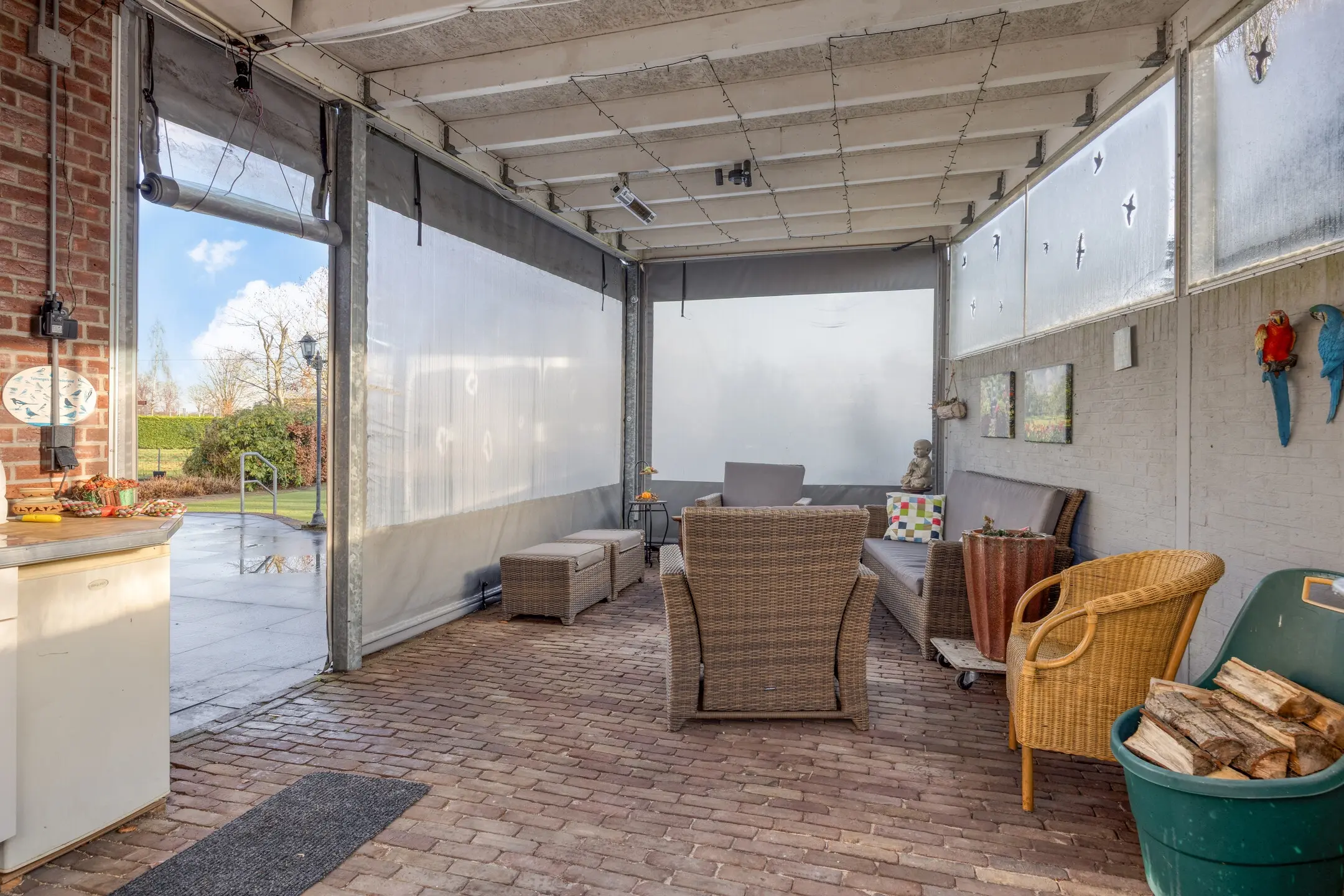 De overkapping vormt een fijne plek om beschut te zitten. Deze is voorzien van een heater, waardoor het hier ook op koelere momenten aangenaam vertoeven is. De aanwezige buitenverlichting accentueert de tuin en zorgt voor een aangename sfeer in de avonduren.