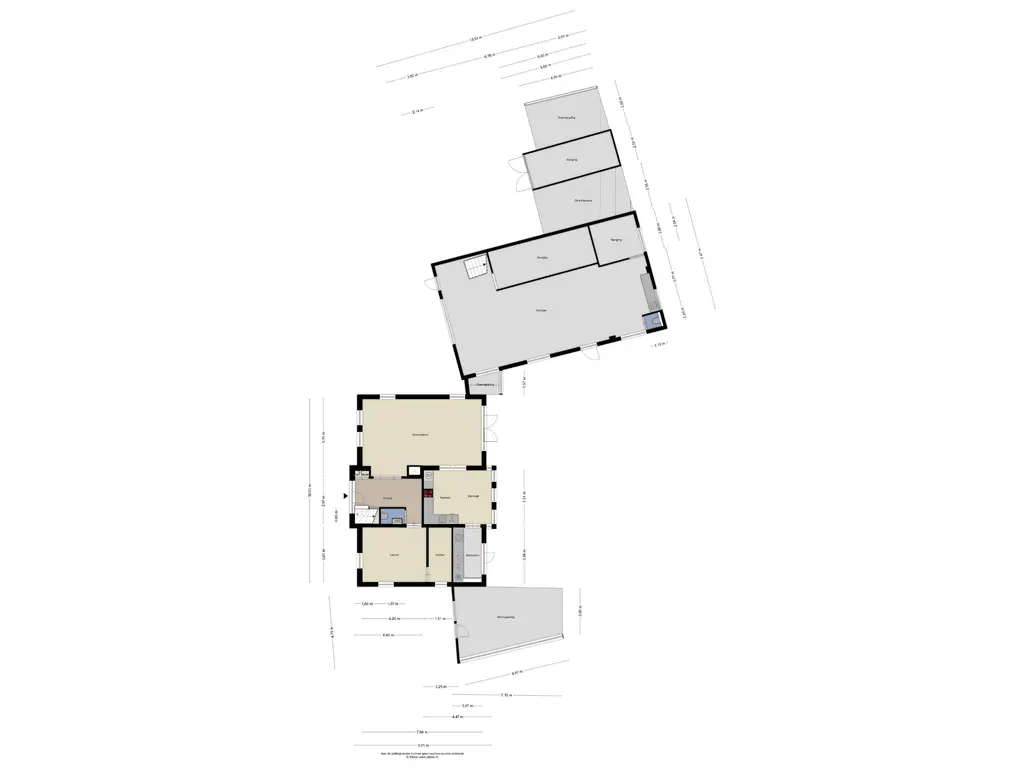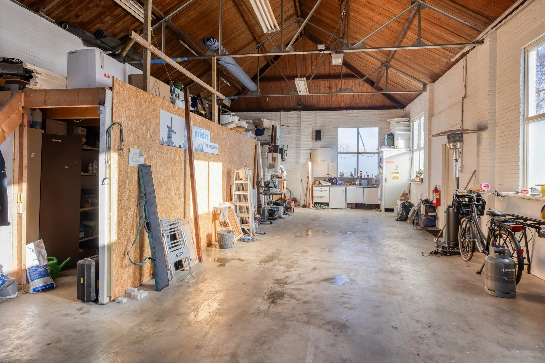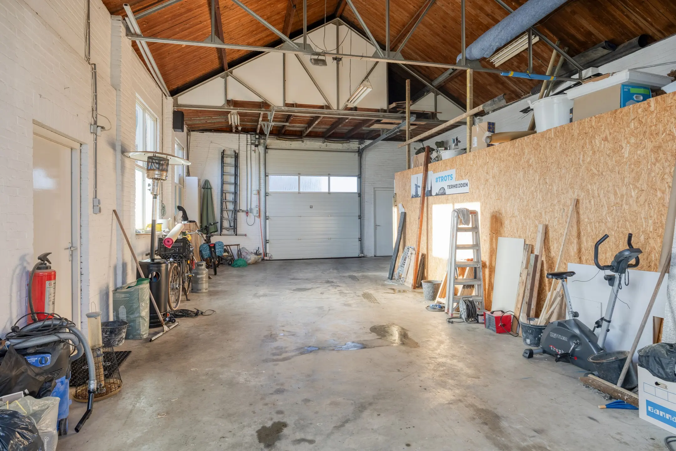 - Loods met overheaddeur (ca. 3,4 m hoog), krachtstroom en voorzieningen