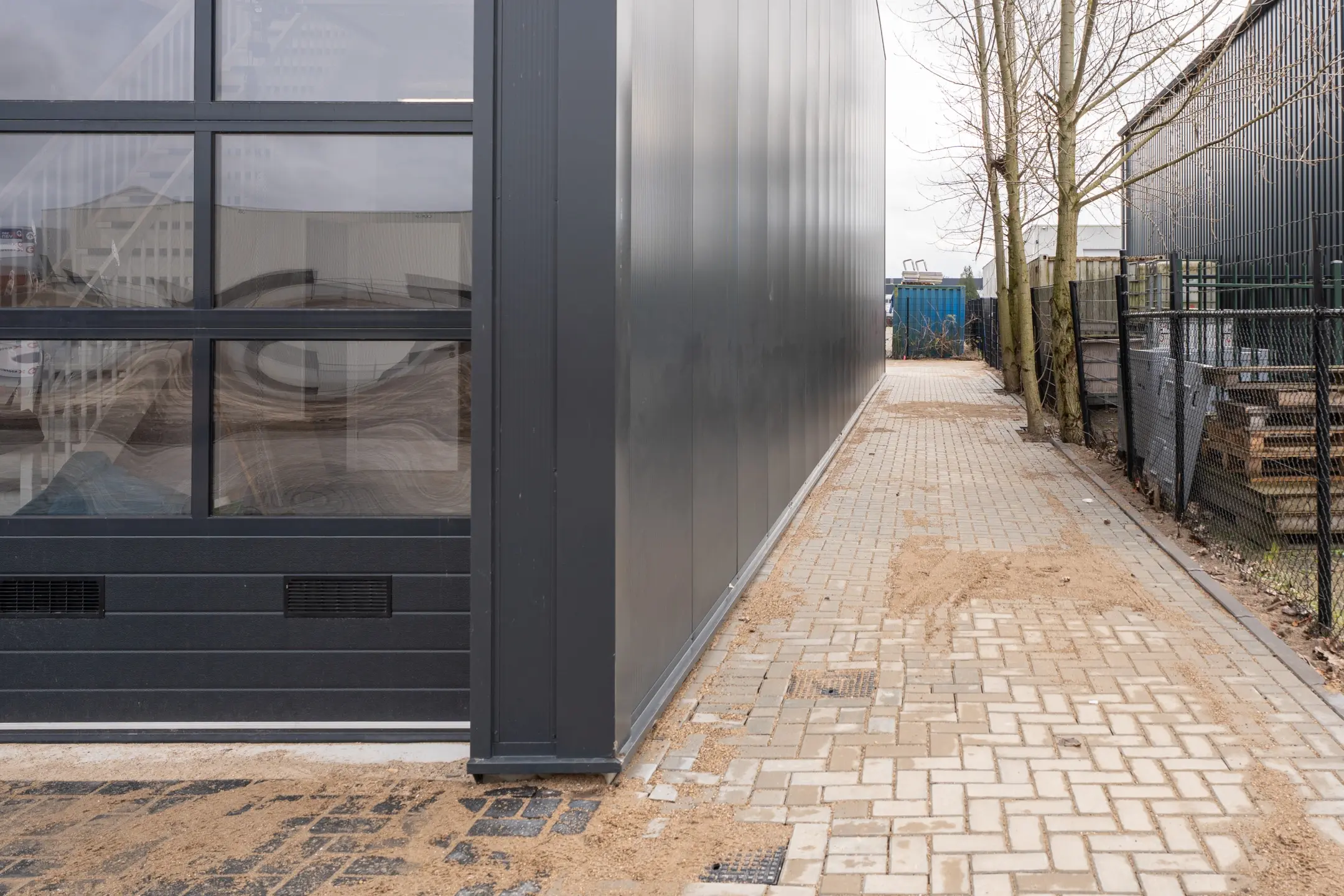 - Opgetrokken in staalconstructie met geïsoleerde sandwichpanelen
