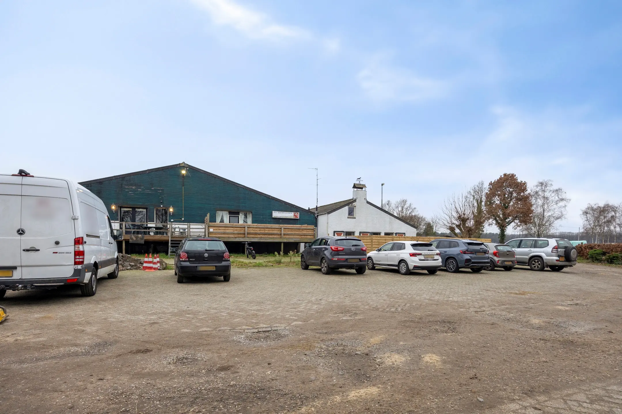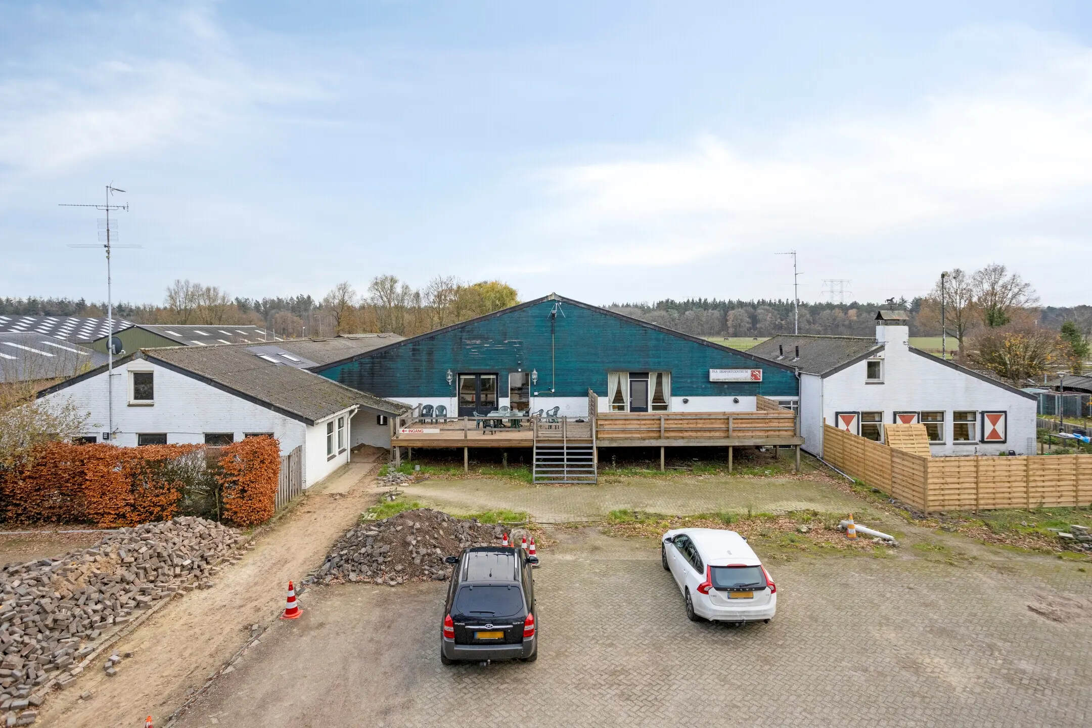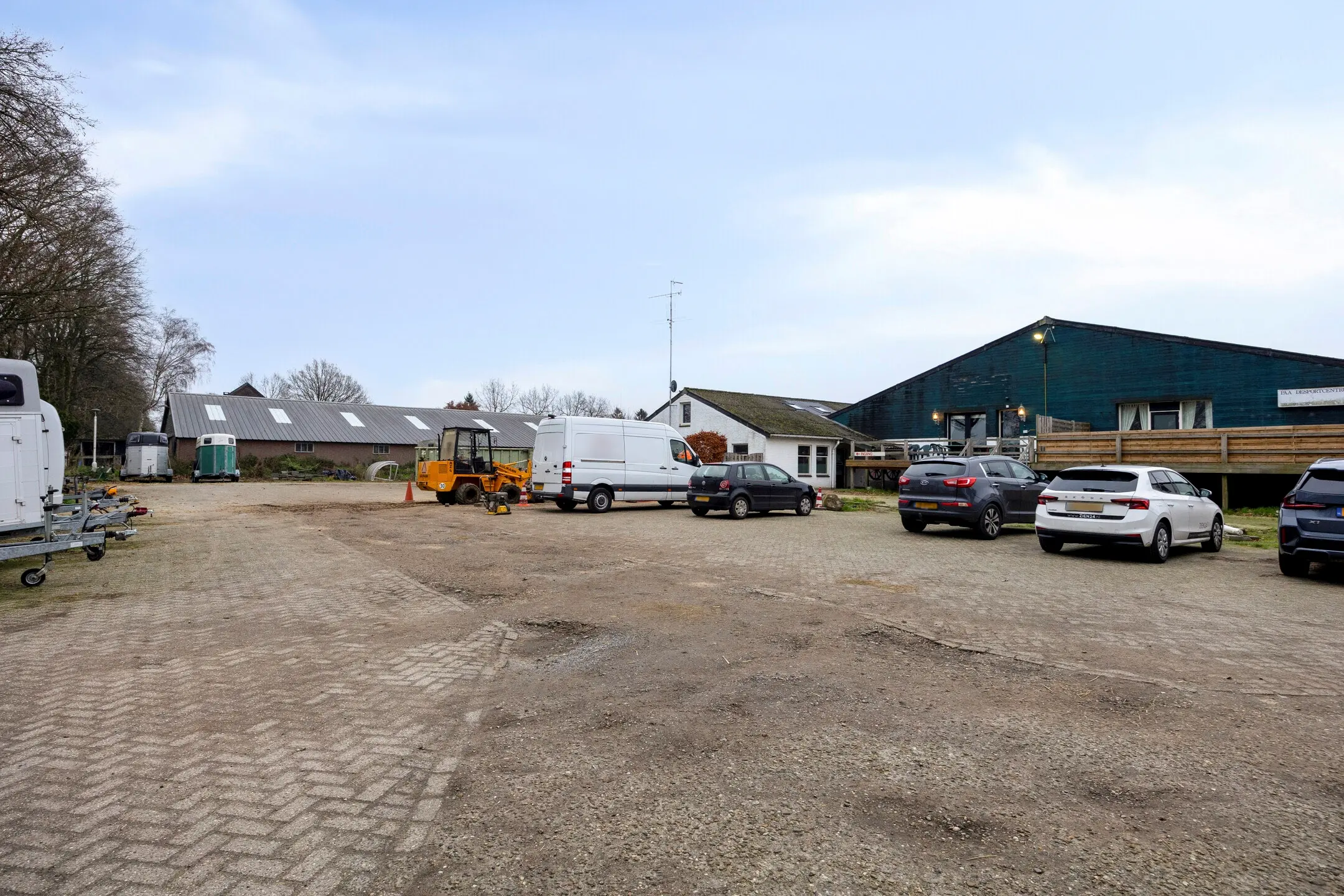 Het erf strekt zich rondom de gebouwen uit en vormt het hart van het geheel. Bij aankomst via één van de twee opritten bereikt u direct het ruime, volledig verharde terrein, uitgevoerd in beton en klinkers. Hier is volop parkeergelegenheid voor auto’s, trailers en bedrijfsvoertuigen, wat de locatie praktisch maakt voor dagelijks gebruik én bezoekers.