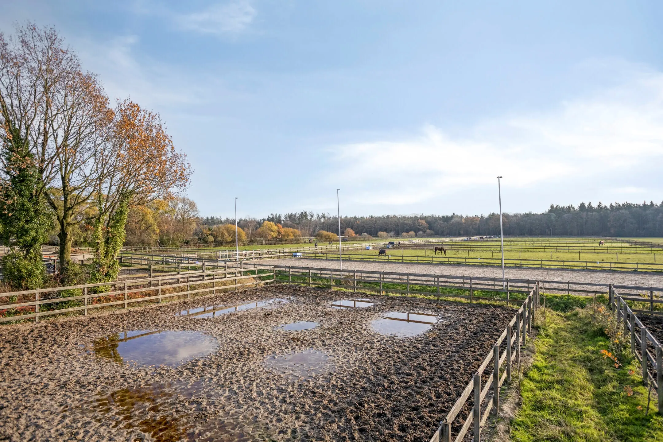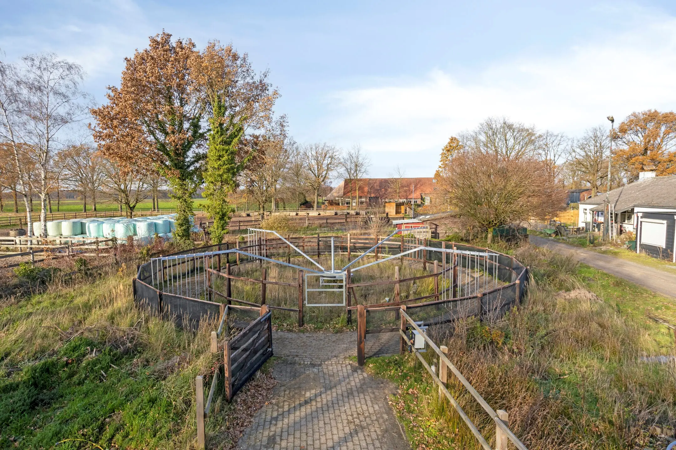 Voor training en beweging zijn aanwezig: een longeercirkel met Wijlaars-bodem en vernieuwde drainage (2024), een vier-paards stapmolen (2024), een buitenpiste van ca. 20 × 60 m, 6 paddocks met verlichting en een springweide. Aan de achterzijde liggen een mestvaalt met betonnen vloer en wanden en twee sleufsilo’s. Deze opzet maakt de locatie geschikt voor uiteenlopende vormen van paardenhouderij, van pensionstalling en instructie tot sport &