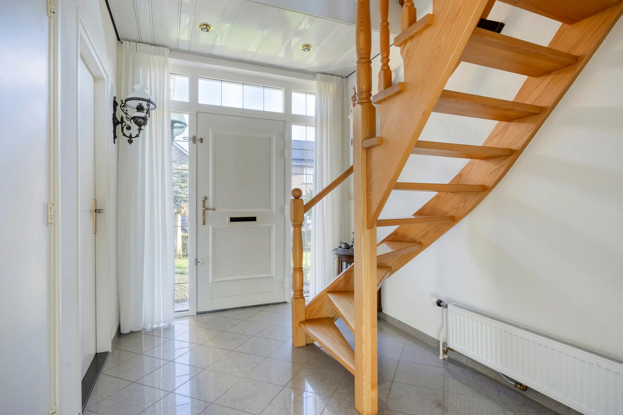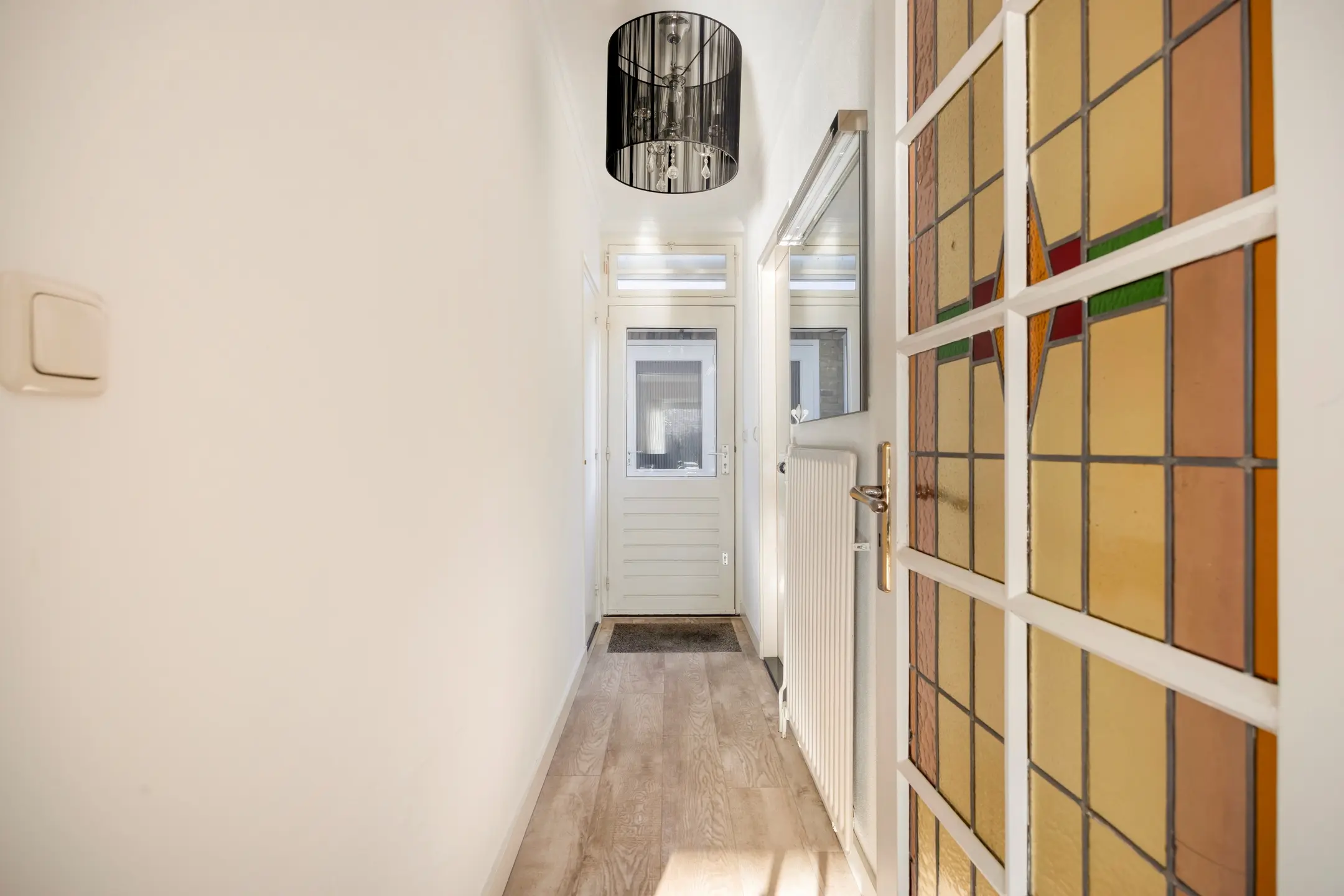 Via de voorzijde betreedt u de woning en komt u binnen in de entree. Vanuit deze entree heeft u enerzijds toegang tot de eetkamer en woonkamer, en anderzijds tot de slaapkamer en badkamer op deze verdieping. Ook bevindt zich hier de trapopgang naar de eerste verdieping. Het hoge plafond geeft de entree een ruimtelijke en verzorgde uitstraling. De wanden zijn afgewerkt met stucwerk, het plafond is hier afgewerkt met een Italiaans systeemplafond en op de vloer ligt een tegelvloer in een lichte kleurstelling.
