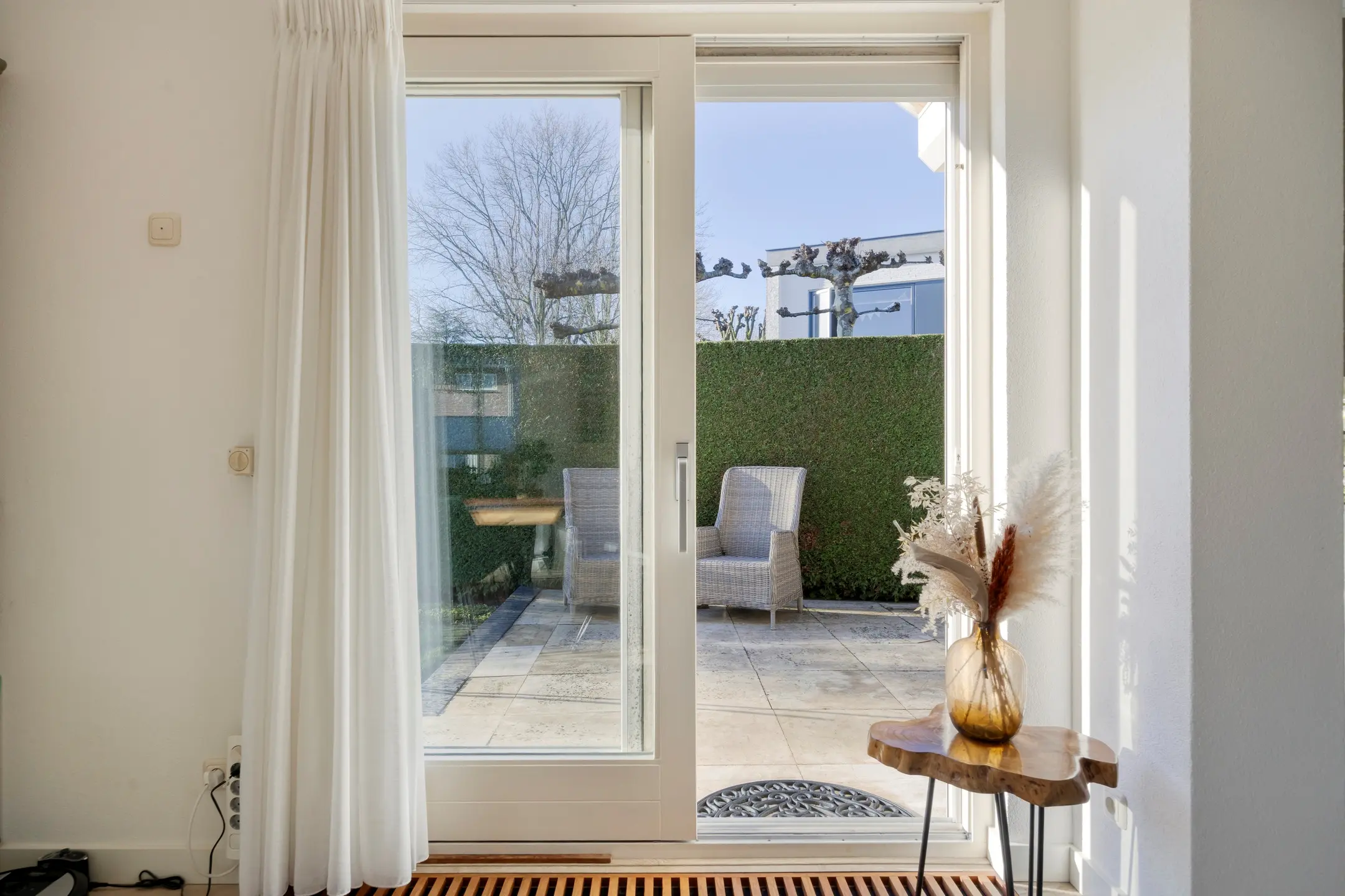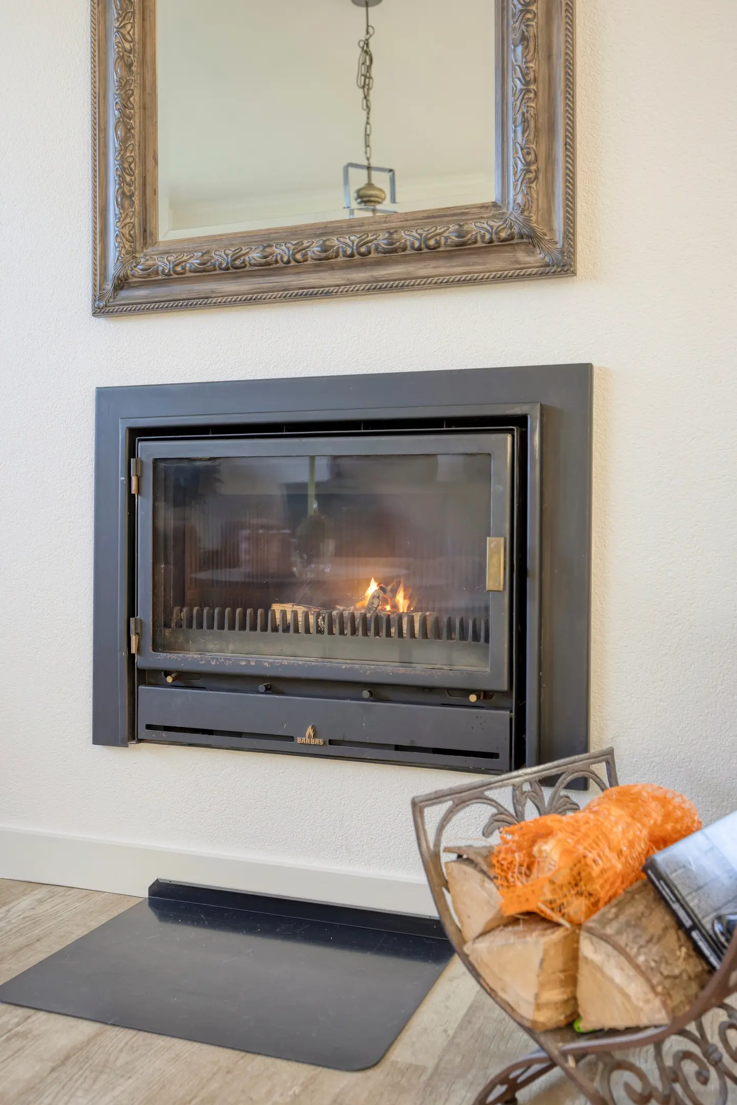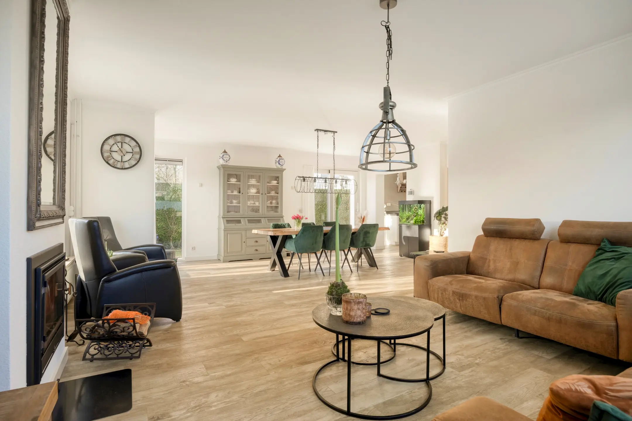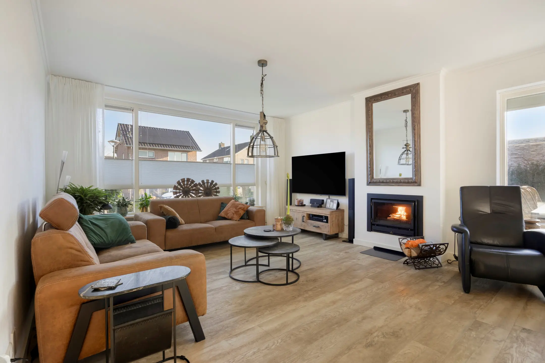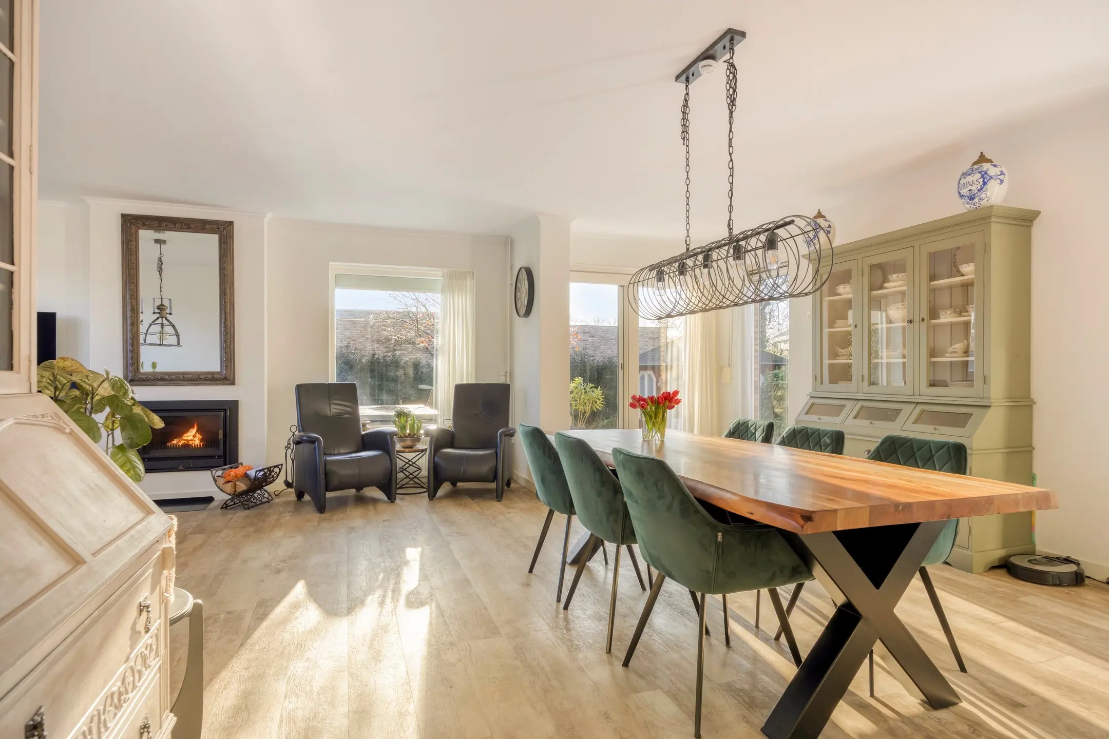 De haard (allesbrander) draagt bij aan een knus en warm woongevoel. Via de openslaande deuren heeft u direct toegang tot de tuin en geniet u tevens van een fijn uitzicht op de tuin.