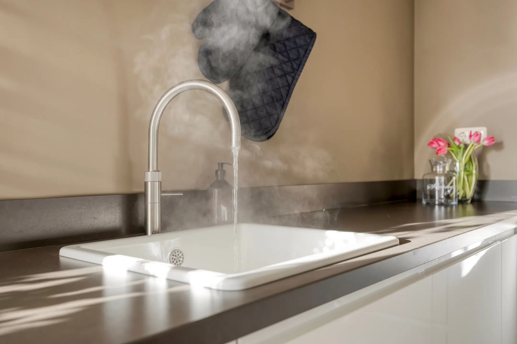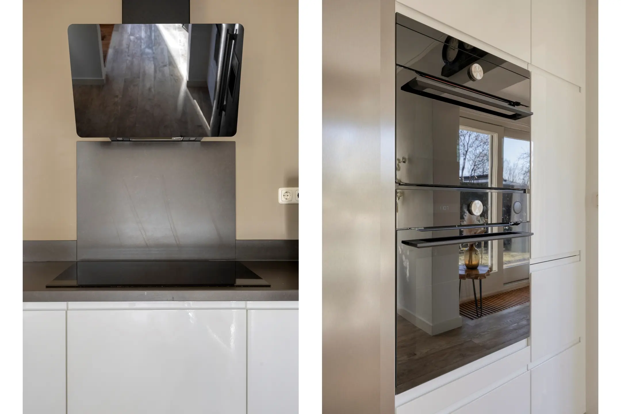 De keuken is geplaatst in een L-opstelling en heeft een moderne, lichte en strakke uitstraling. Er is meer dan voldoende bergruimte in diverse kasten en verder is de keuken ingericht met een spoelbak met Quooker kraan, inductie kookplaat met afzuigsysteem, een oven en een magnetron oven, vaatwasser en een grote koel-/vrieskast (deze blijft niet achter bij verkoop).
