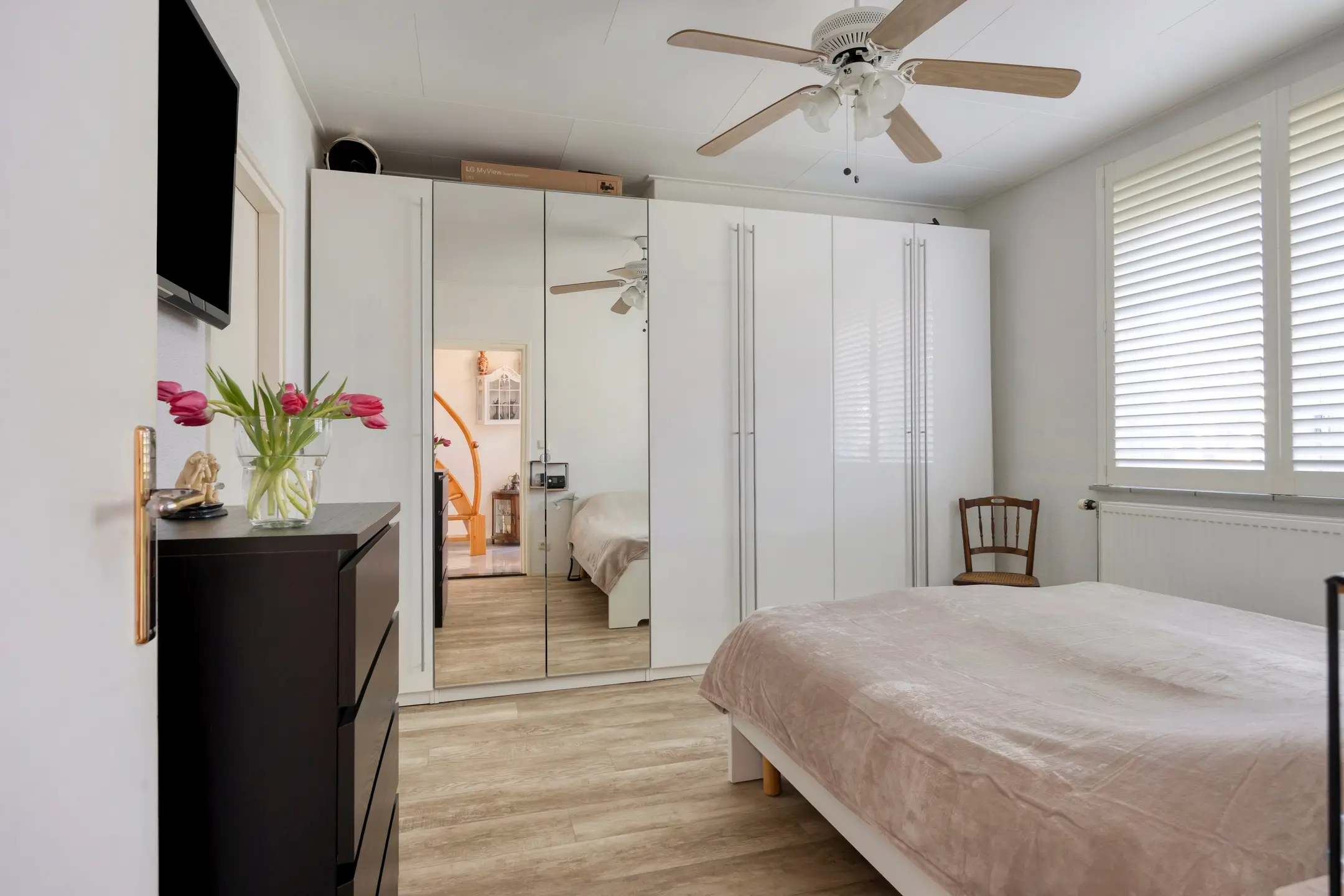 Vanuit de entree is er tevens toegang tot de slaapkamer met aansluitende badkamer. De nette PVC vloer is doorgelegd in de slaapkamer, de wanden zijn hier afgewerkt met stucwerk en het plafond met Agnes platen. Het is een ruime kamer die meer dan voldoende ruimte biedt voor een tweepersoonsbed en grote kledingkast.
