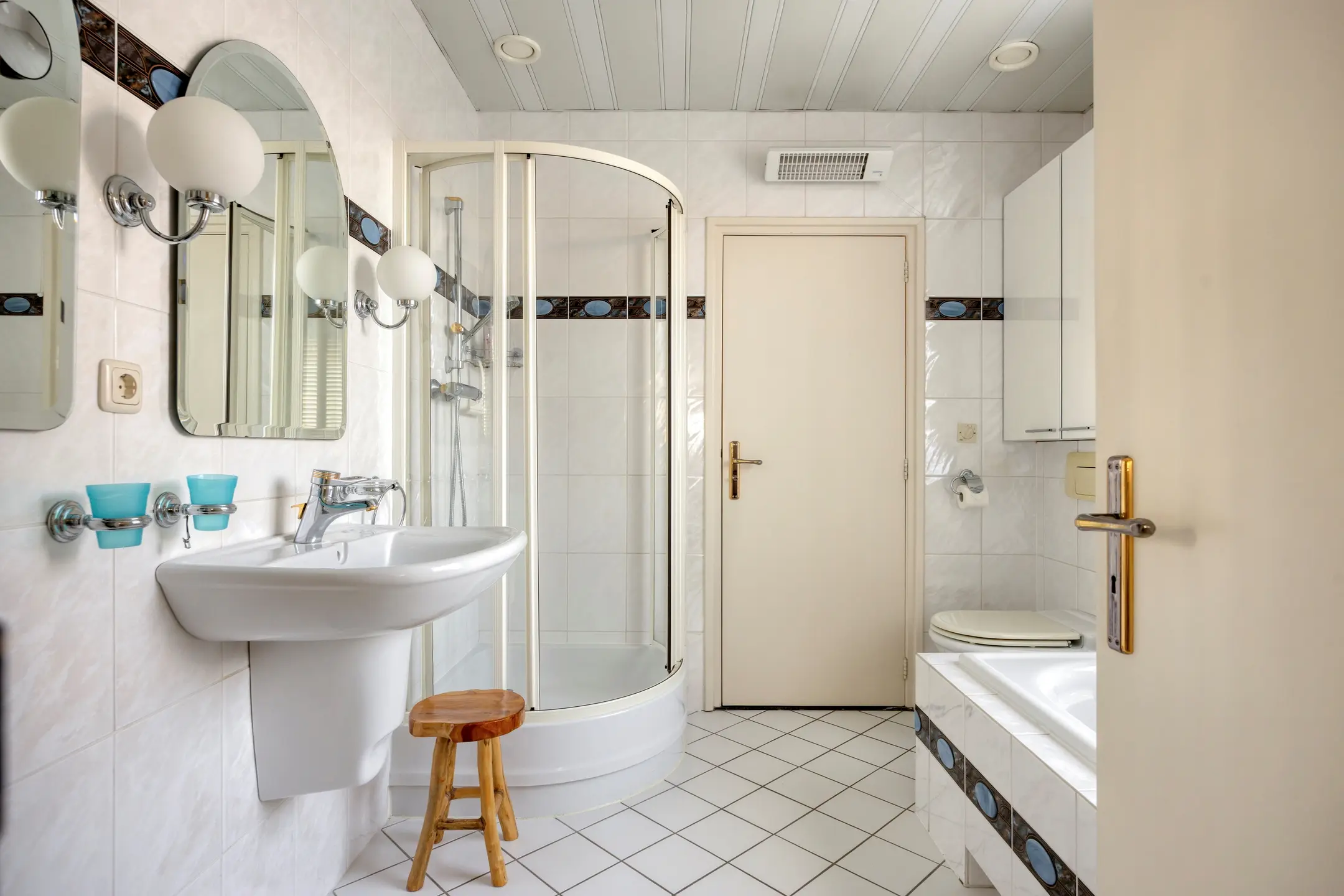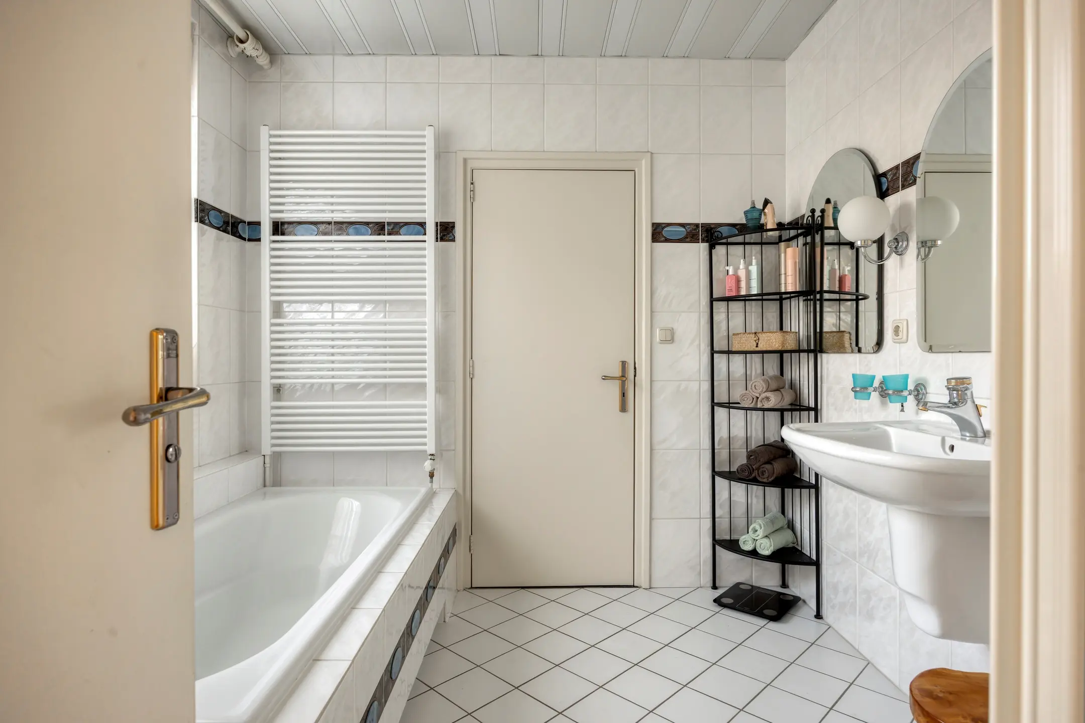 De badkamer is direct toegankelijk vanuit de slaapkamer, wat zorgt voor extra comfort en is ideaal voor een brede doelgroep. Daarnaast is de badkamer ook bereikbaar vanuit de naastgelegen hal. De vloer en wanden zijn volledig betegeld en het plafond is afgewerkt met een Italiaans systeemplafond. De ruimte is ingericht met een wastafel, toilet, douchecabine, ligbad en designradiator. Dankzij het aanwezige raam is natuurlijke ventilatie mogelijk.