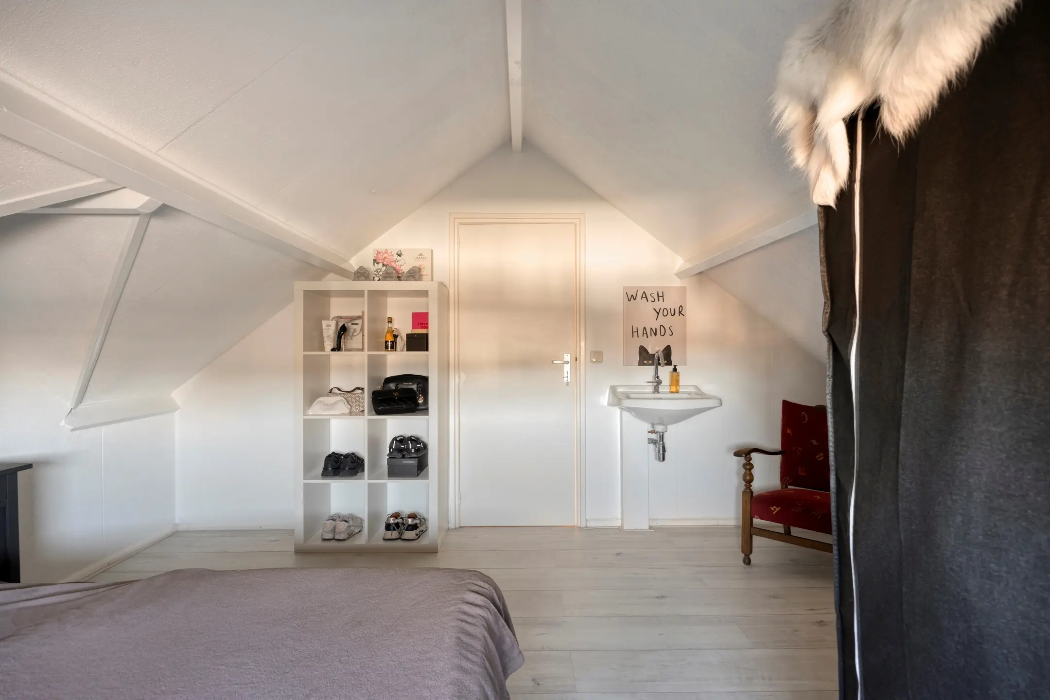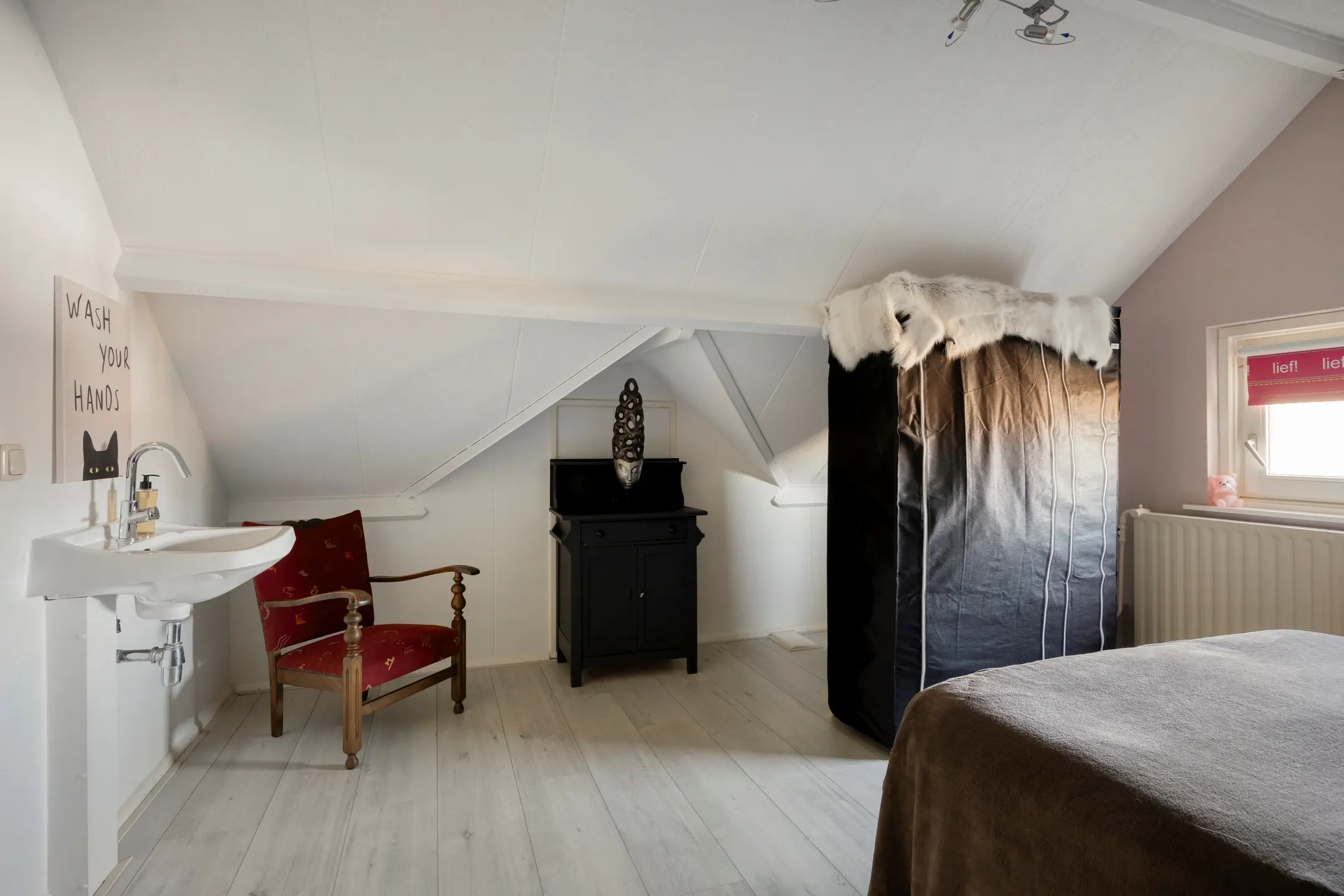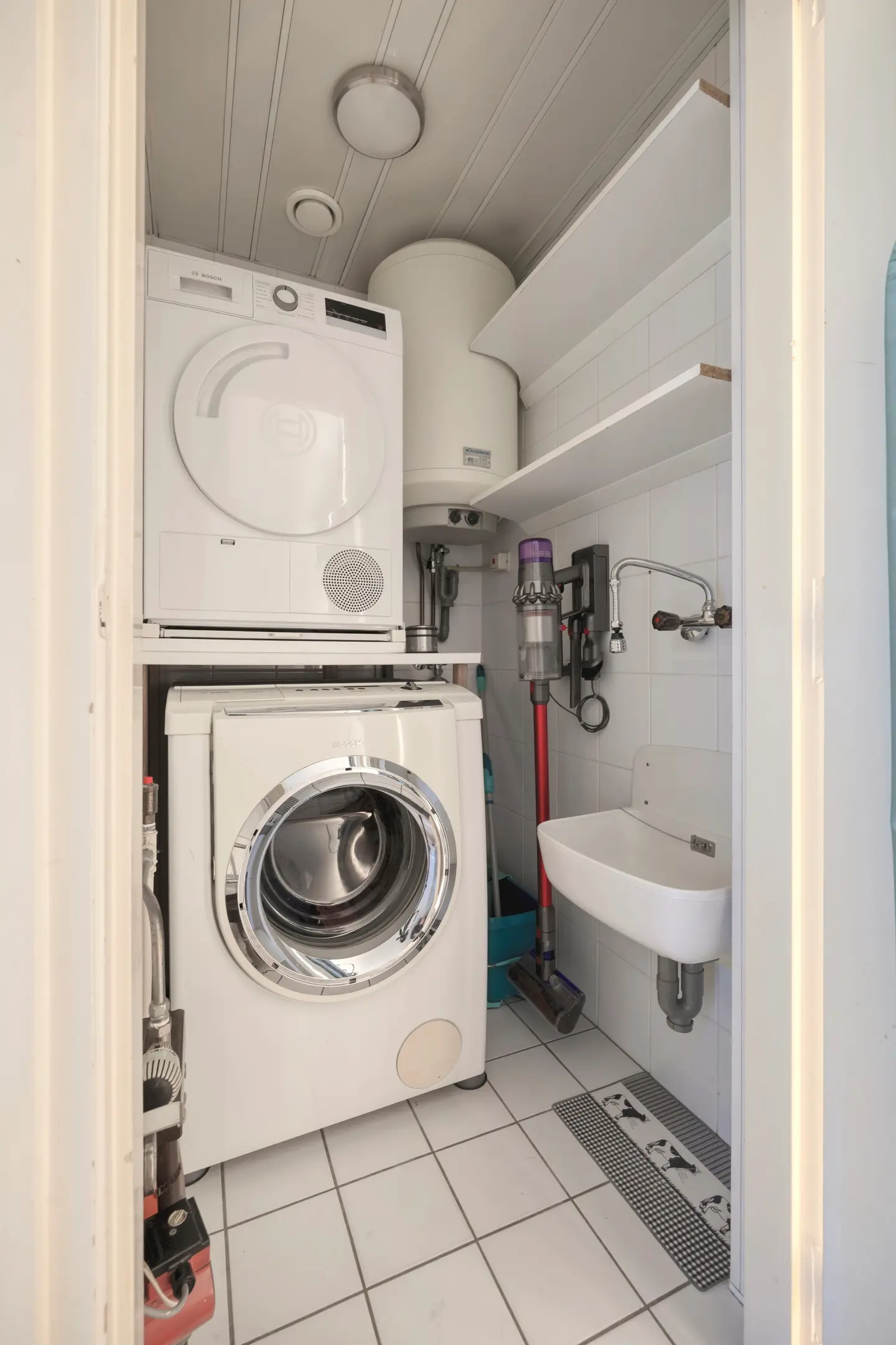Direct naast de badkamer bevindt zich een afgesloten ruimte, momenteel in gebruik als wasruimte, met plaats voor de was apparatuur. Ook de boiler en een wastafel zijn hier aanwezig.