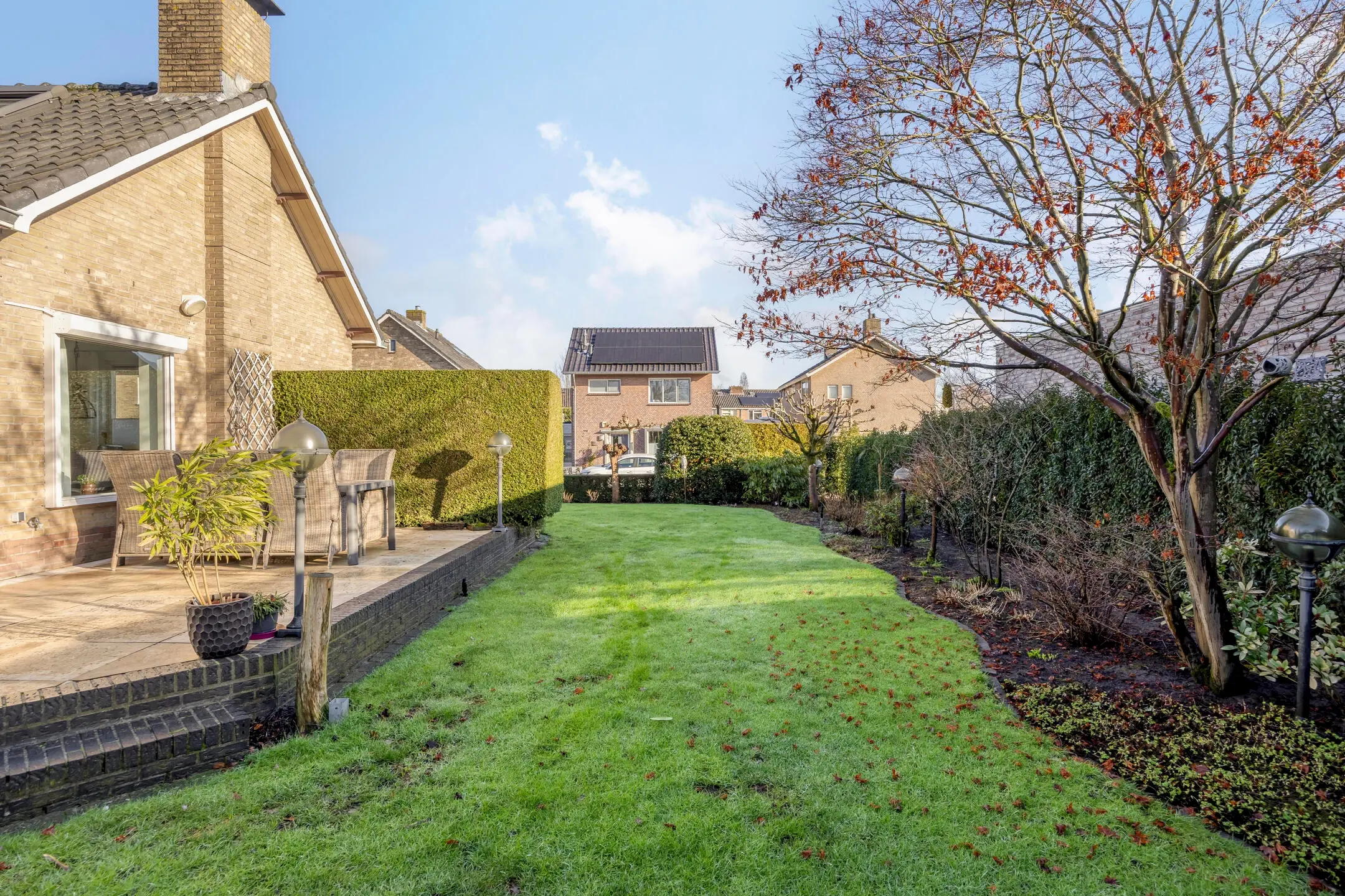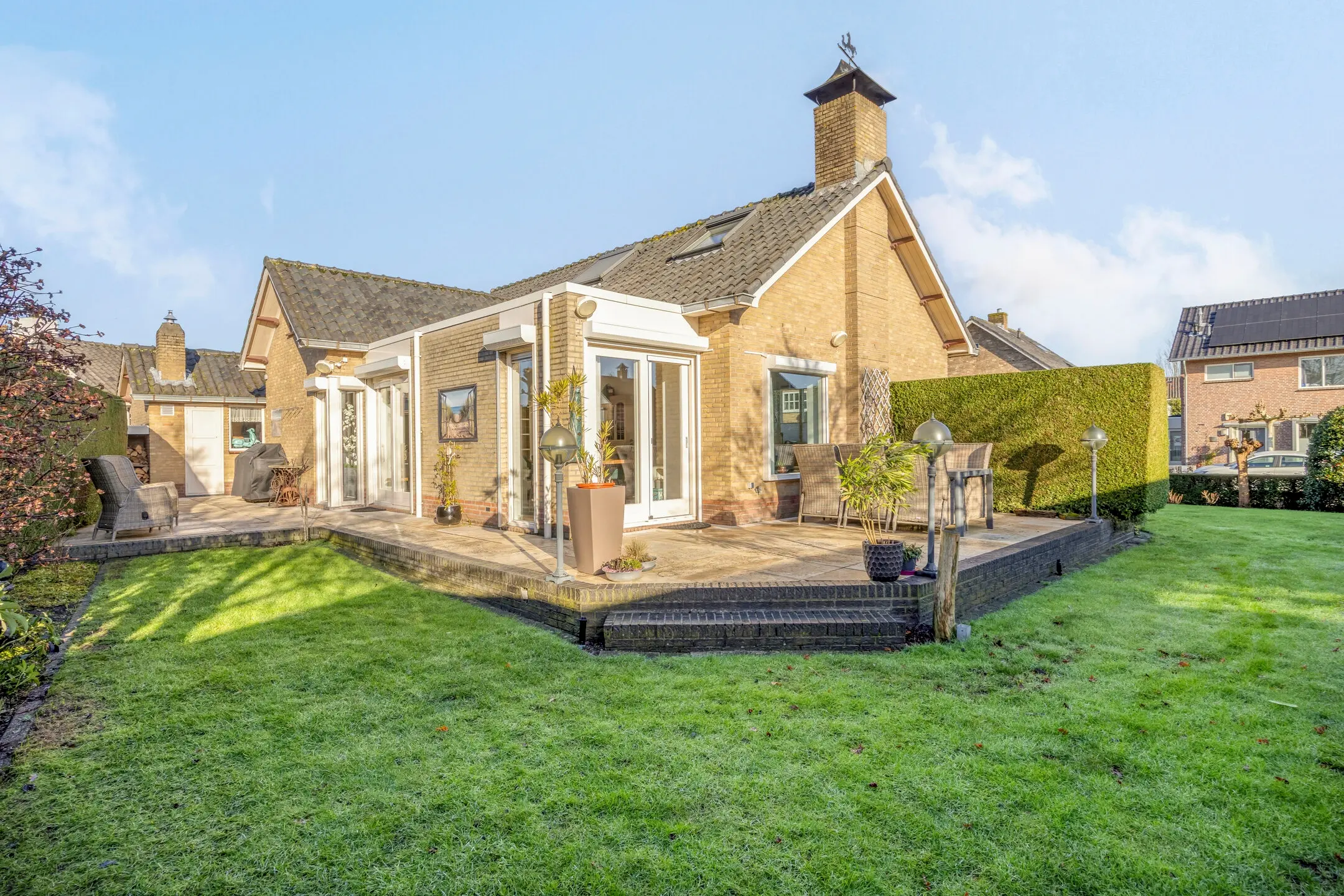 De fraai aangelegde tuin rondom is keurig onderhouden en biedt een heerlijke buitenbeleving. Dankzij de meerdere terrassen is er op elk moment van de dag een passend plekje te vinden om te genieten van zon of schaduw.